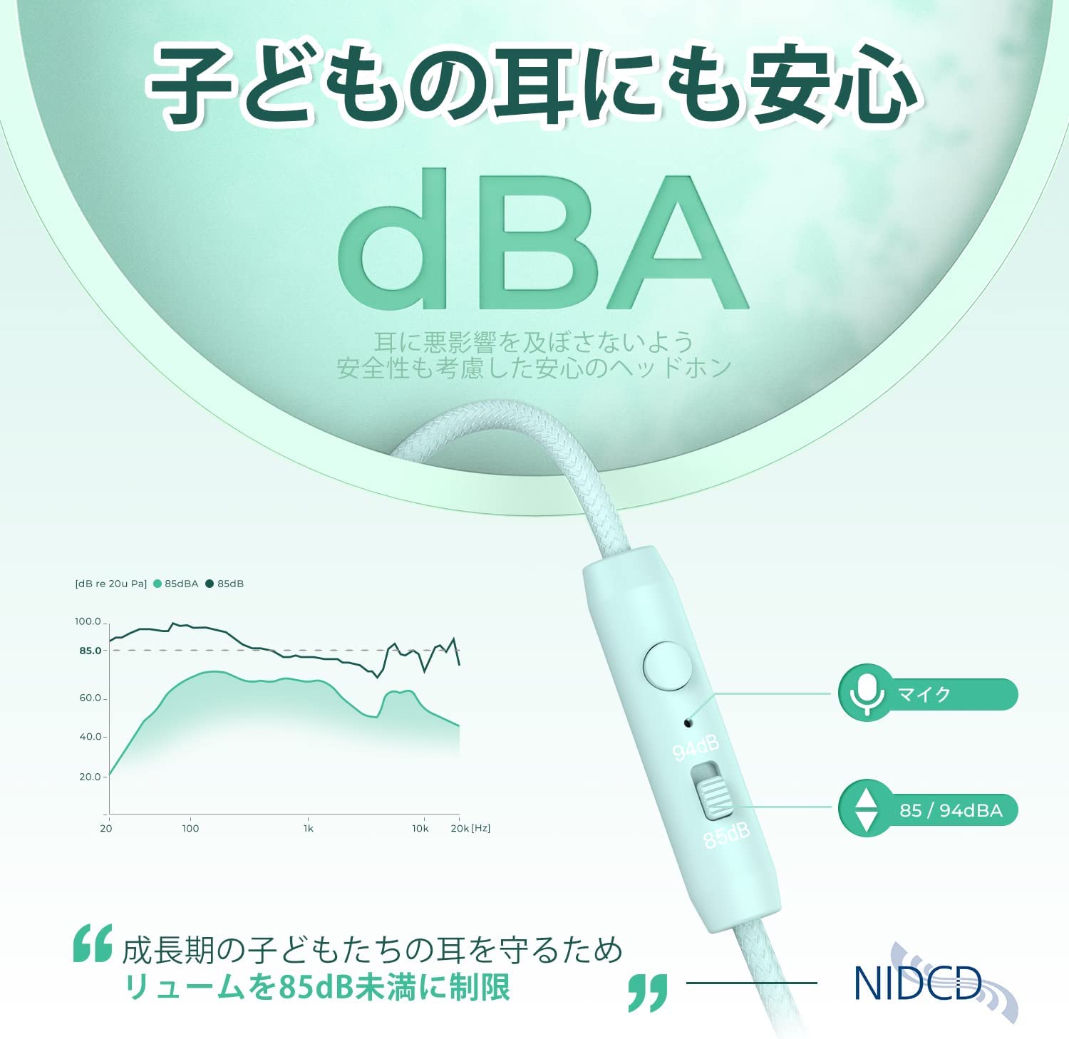 聴力保護のため、サウンド制御回路が内蔵されています。対応ボリュームの最大値を94dB/85dBの2段階で調節可能。使用環境に応じてヘッドホンの音量レベルを調節し、新幹線や飛行機などの交通機関でも耳を刺激しないよう適度な音量で楽しむことができます。