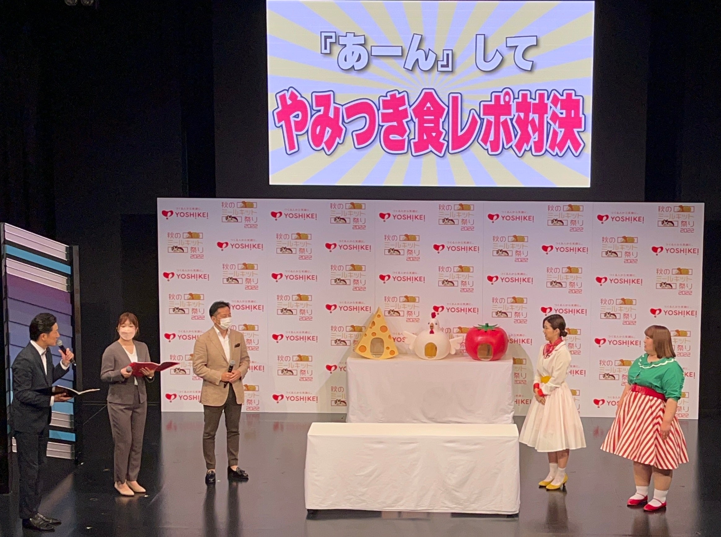 記者会見では、CM撮影時と同じ衣装を着用した3時のヒロインが登壇。新CMの先行上映を始め、同じコラボメニューを開発した料理研究家Mizukiさんの「やみつきメニュー」を3時のヒロインが試食を実施。さらに、「やみつき」に因んだ企画コーナー【『あーん』してやみつき食レポ対決】にも挑戦。ヨシケイ開発株式会社平野取締役から「あーん」をしてもらった後に、満面の笑みを浮かべてメニュー紹介をする様子に会場が大盛り上がりしました。