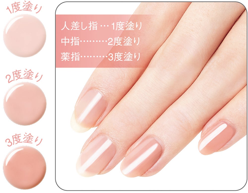 自爪の上に直接塗ります。塗り重ねる回数でお好みの色に調整できます。