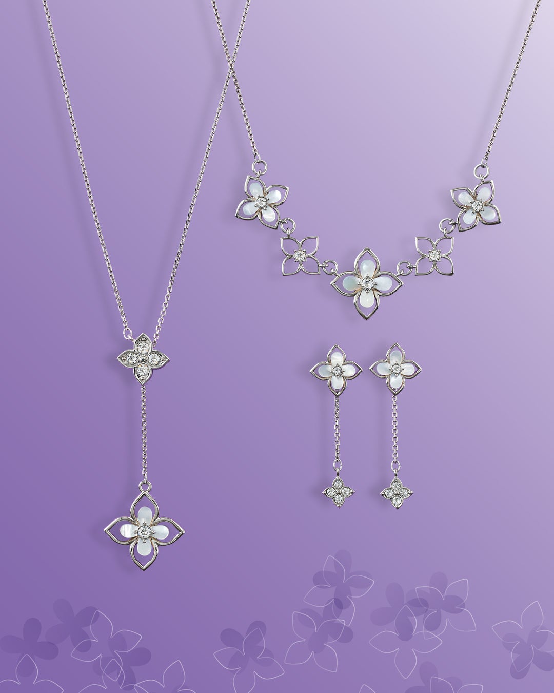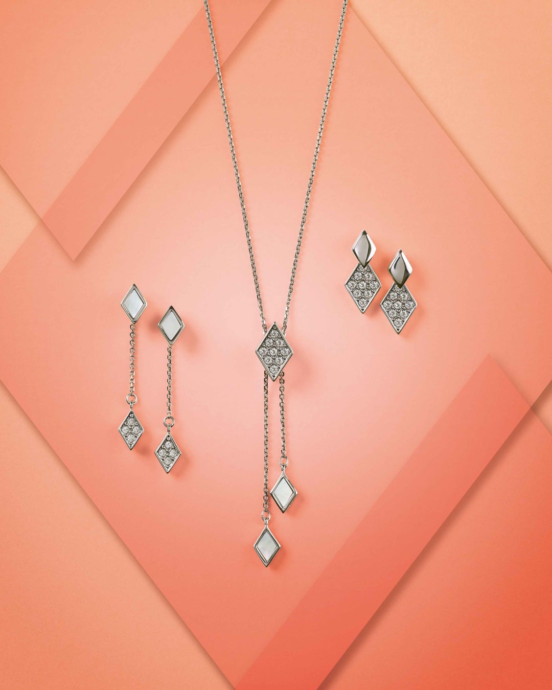 ネックレスはチェーンで下がる白蝶貝のダイヤモチーフが揺れ、上品な胸元を演出いたします。スライドタイプなので、お好みの長さに変えることができ、さまざまなスタイリングをお楽しみいただけます。(画像中)