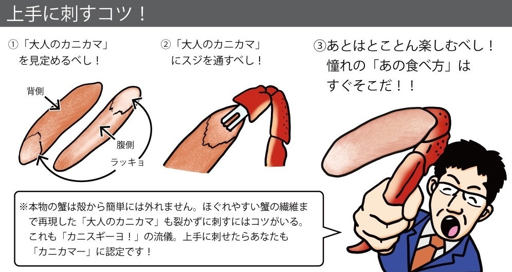 本製品はカニカマ開発の第一人者である株式会社スギヨ監修のもと、ずわい蟹のカニ脚を忠実に再現したピックで、「大人のカニカマ」を食べる際に一層「カニ感」を楽しめるスペシャルなアイテムとなっている。