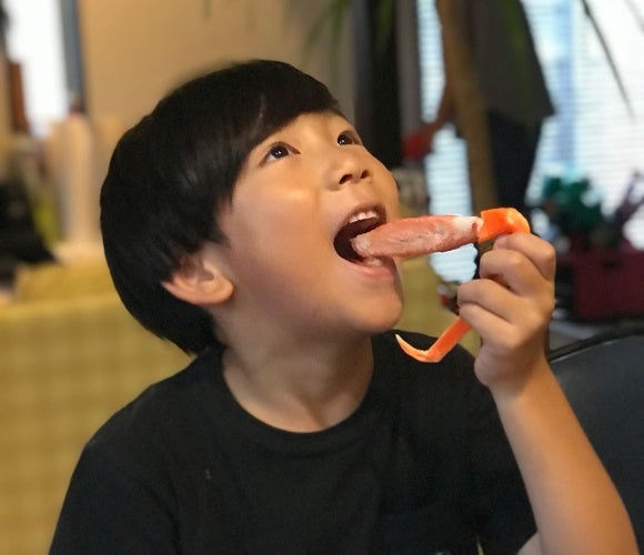 上を向いて大きく口を開き、手に持ったカニのむき身を頬張る――。