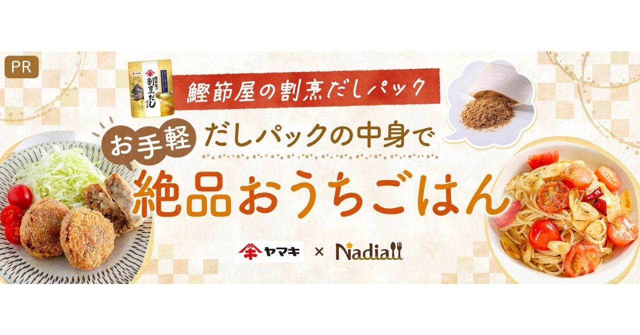 Nadia株式会社(東京都港区/代表取締役社長 葛城嘉紀 以下「Nadia」)とヤマキ株式会社(愛媛県伊予市/代表取締役社長 城戸 善浩 以下「ヤマキ」)がタイアップし、特別企画ページ【鰹節屋の割烹だしパック だしパックの中身で お手軽絶品おうちごはん】を公開いたしました。