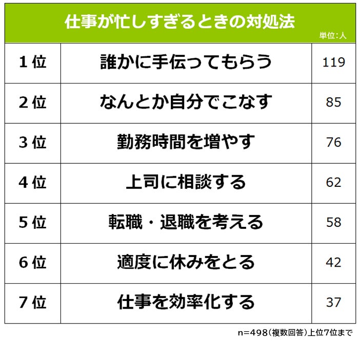 最後に「仕事が忙しすぎるときの対処法」を聞いたところ、1位は「誰かに手伝ってもらう(119人)」でした。