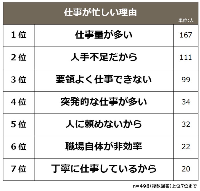 現在お仕事をしている498人に「仕事が忙しい理由」を聞いたところ、1位は「仕事量が多い(167人)」でした。2位「人手不足だから(111人)」、3位「要領よく仕事できない(99人)」、4位「突発的な仕事が多い(34人)」と続きます。