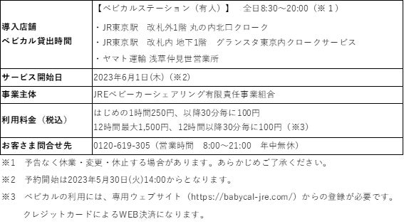 ◆今回、ヤマト運輸株式会社と連携し、JR東京駅の2か所「改札外1階 丸の内北口クローク」・「改札内地下1階 グランスタ東京内クロークサービス」及び「ヤマト運輸 浅草仲見世営業所」で6月1日(木)よりサービスの実証実験を開始します。浅草エリアでの貸出はベビカルとして初となります。今後、お客さまのご利用状況をみながら、同社が運営する手ぶら観光サービス案内所や営業所等にサービスを拡大していく予定です。