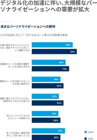 デジタルなエンゲージメントの増加により、企業はデジタルツールを活用してパーソナルなエクスペリエンスを提供できるということを多くの顧客が理解するようになりました。契約更新の通知を事前に行うなど、顧客のニーズを理解して先回りして対応することを求める顧客が増えています。また、ほとんどの顧客が、常にオファーをパーソナライズすることを企業に対して期待しています。「企業が顧客を人としてではなく数字として取り扱っている」と答える回答者の割合が減少していることからも、デジタル変革への投資が効果を上げていることがわかります。優れたデジタルエクスペリエンスを継続的に使用することによって顧客の期待が高まっていくと、デジタルエクスペリエンス強化のための追加投資が叶わない業績不振の企業は、プレッシャーが大きくなっていく可能性があります。