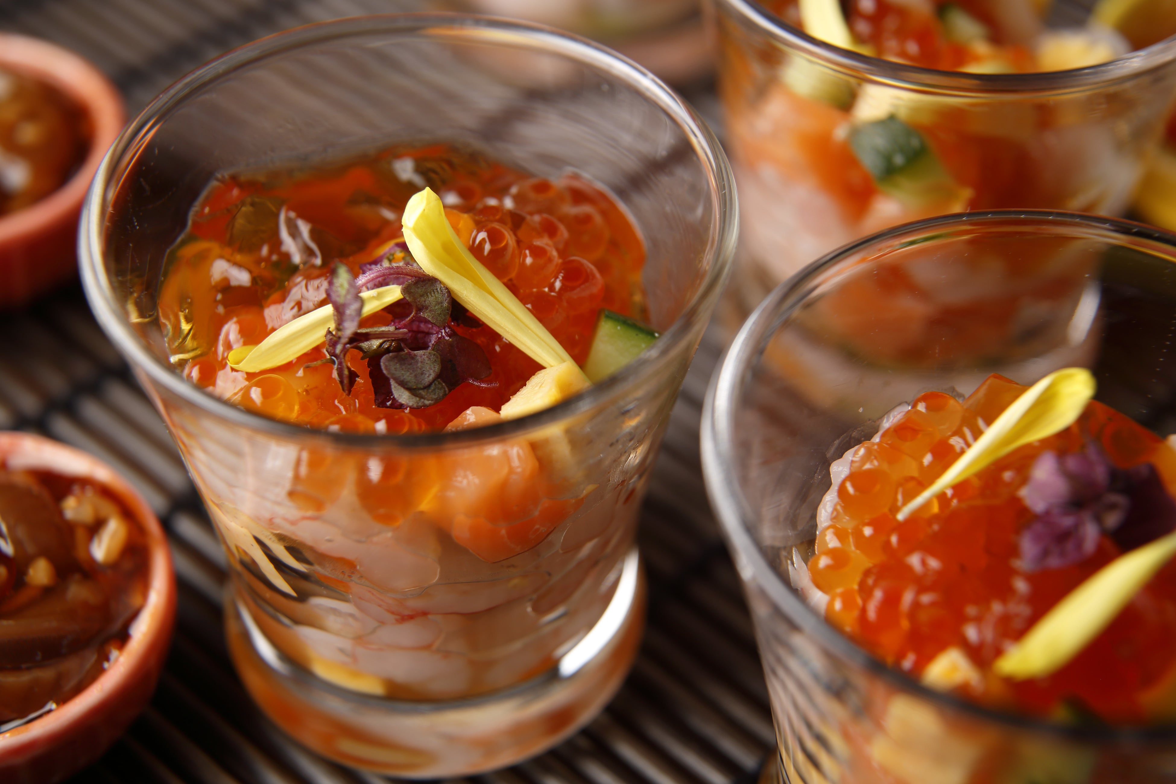 また、甘海老・いくら・サーモンなどの具材に醤油のジュレを添えた、カクテル仕立ての「海鮮まかない丼」もご用意いたします。小ぶりなサイズで食べやすく、そのままでも、ご飯にかけてもおいしくお召しあがりいただけます。