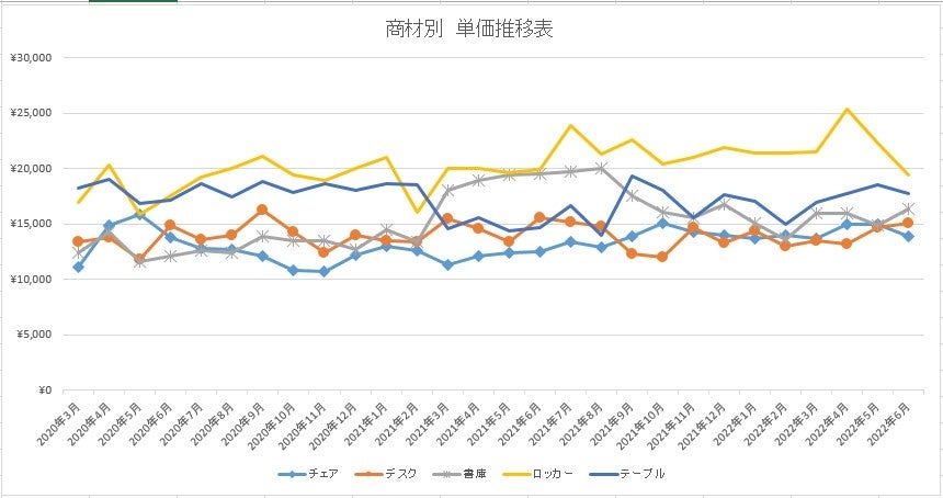 4ヶ月ぶりに連続単価減少した。しかし大型のテーブルの需要も徐々に回復しており、オフィス作りにおいてテレビ会議などが主流になってきていても、オフィスワーカーの中で会議スペースは必要という再認識されてきつつある。