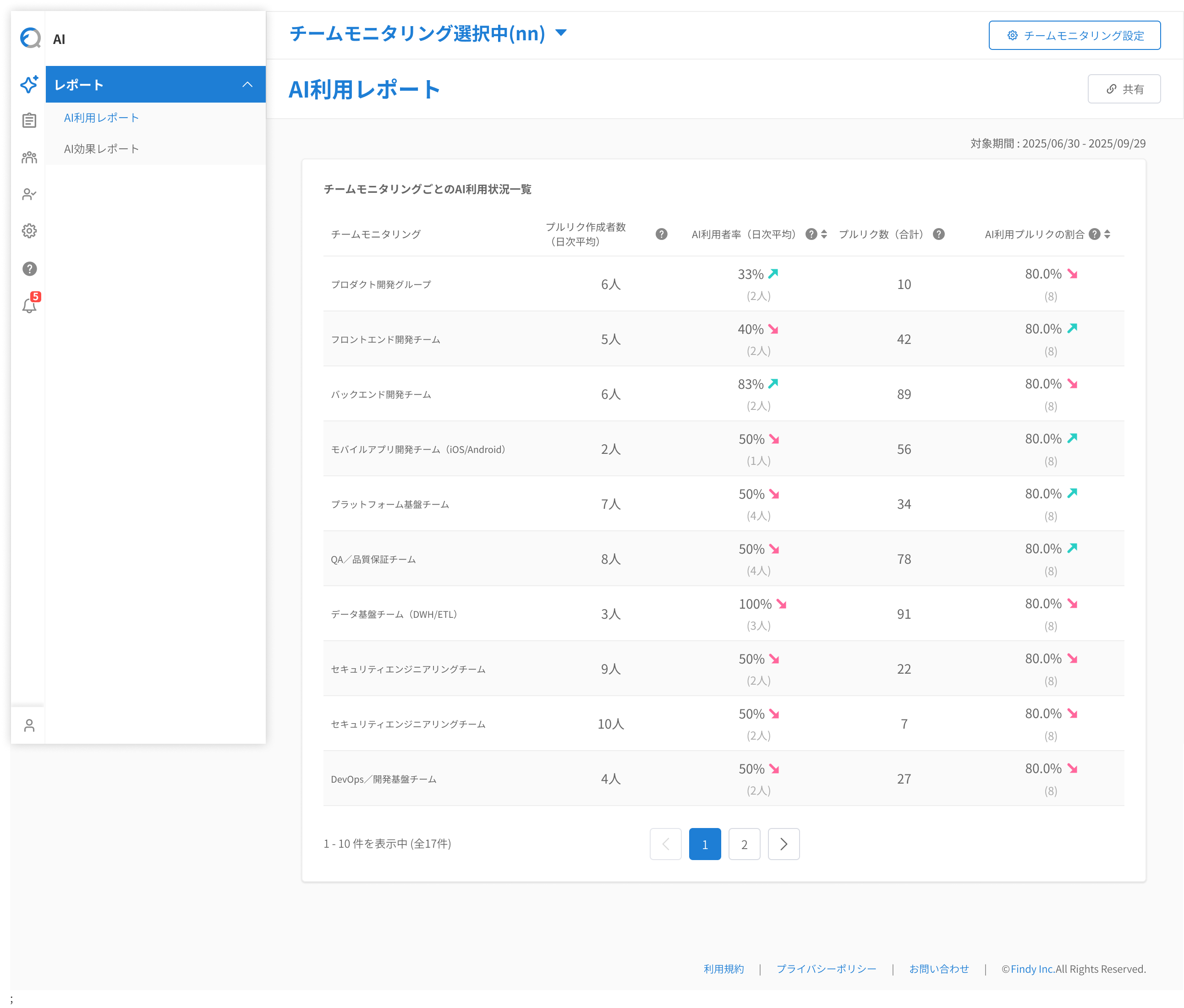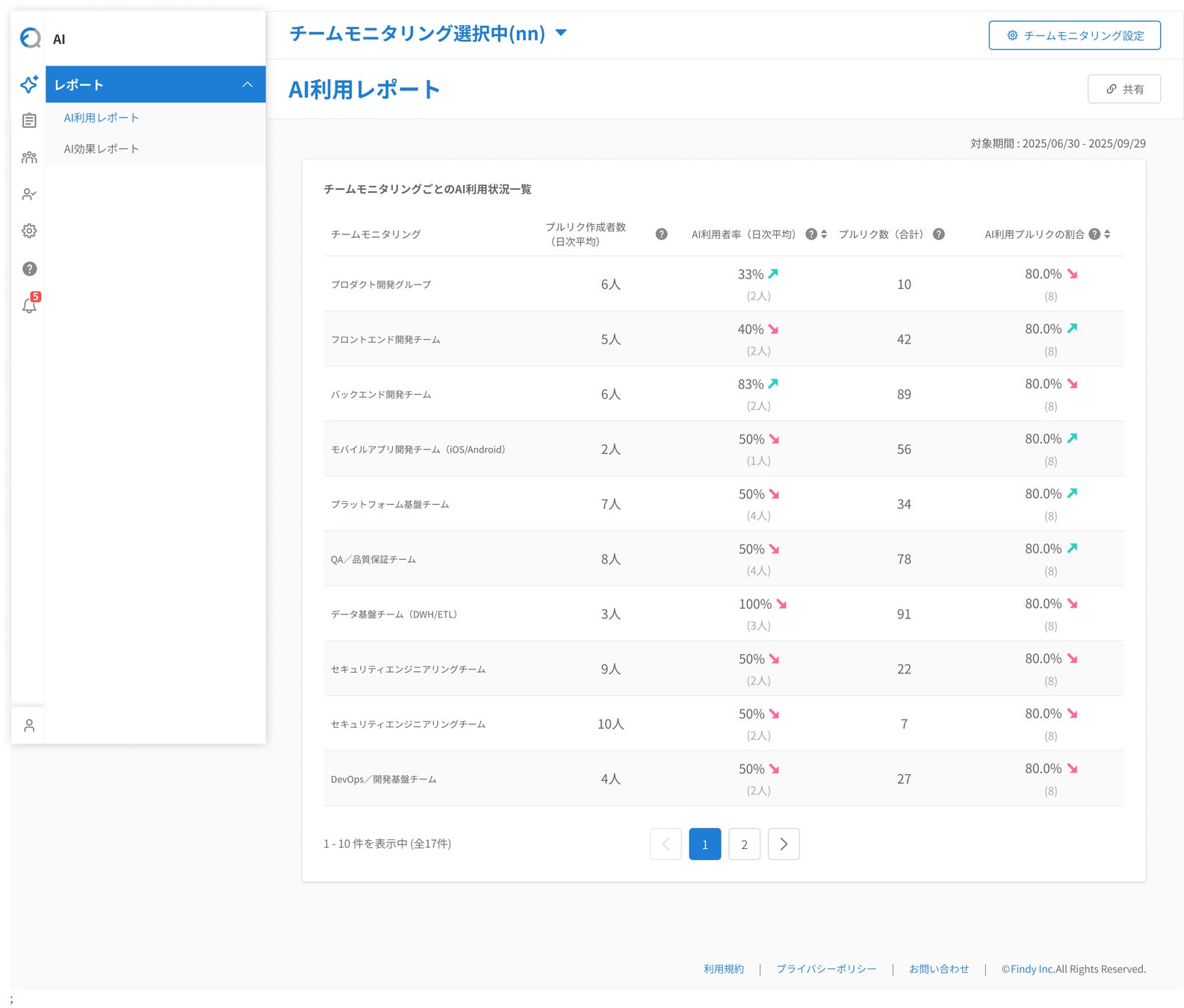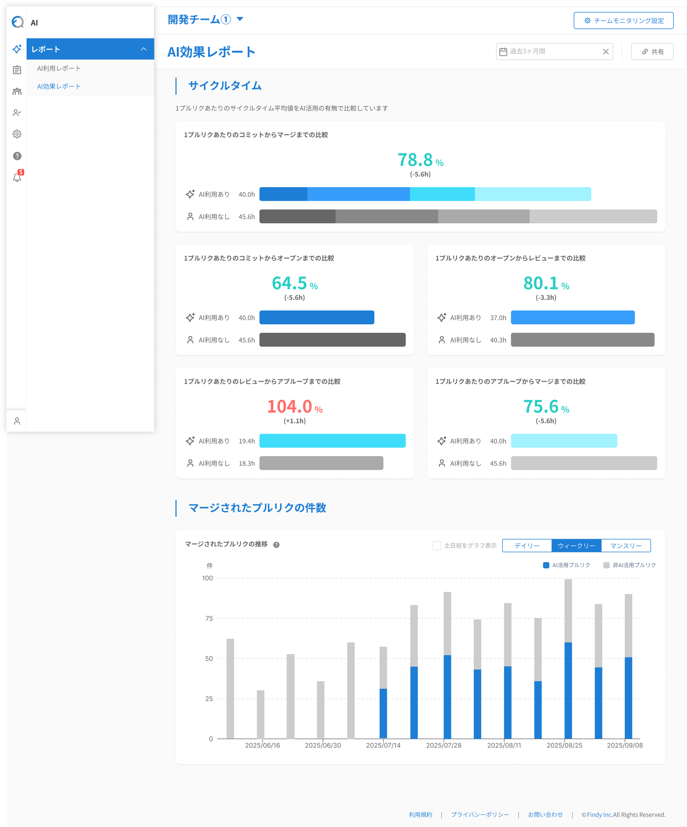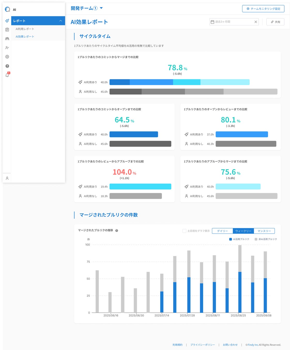 エンジニアプラットフォームを提供するファインディ株式会社(東京都品川区、代表取締役:山田 裕一朗、以下「当社」)は、経営と開発現場をつなぐAI戦略支援SaaS「Findy Team+」において、開発チームによる生成AI活用状況とその効果を定量的に測定・比較できる新機能「AI利用レポート」および「AI効果レポート」を2025年10月30日(木)にリリースしたことを発表します。
