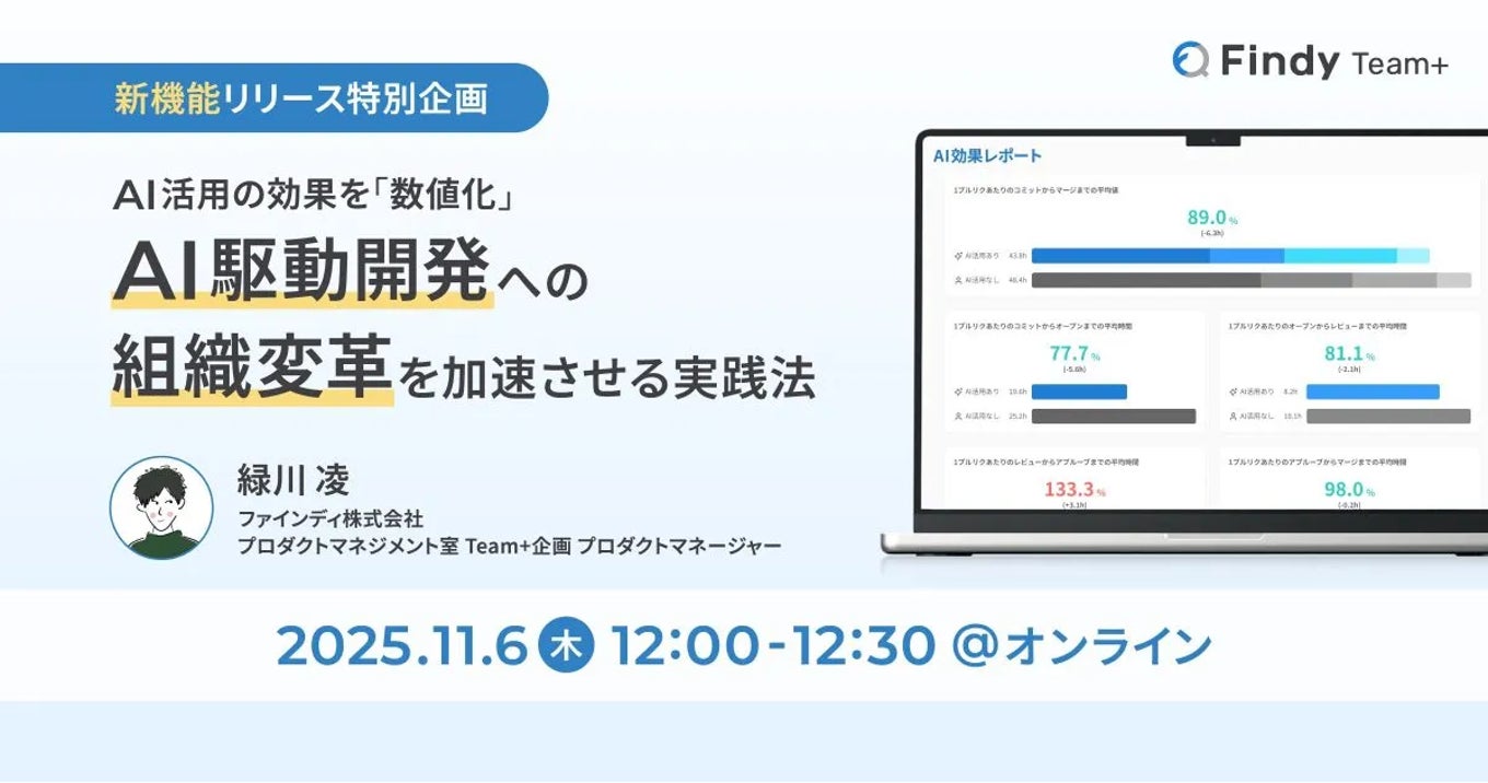 新機能のリリースにあわせて、オンラインセミナー「AI駆動開発への組織変革を加速させる実践法」 を、11月6日(木)12:00〜12:30に開催いたします。本セミナーでは、AI活用の成果を「数値」で可視化し、AI駆動開発に向けた組織変革を加速させる実践手法をご紹介します。