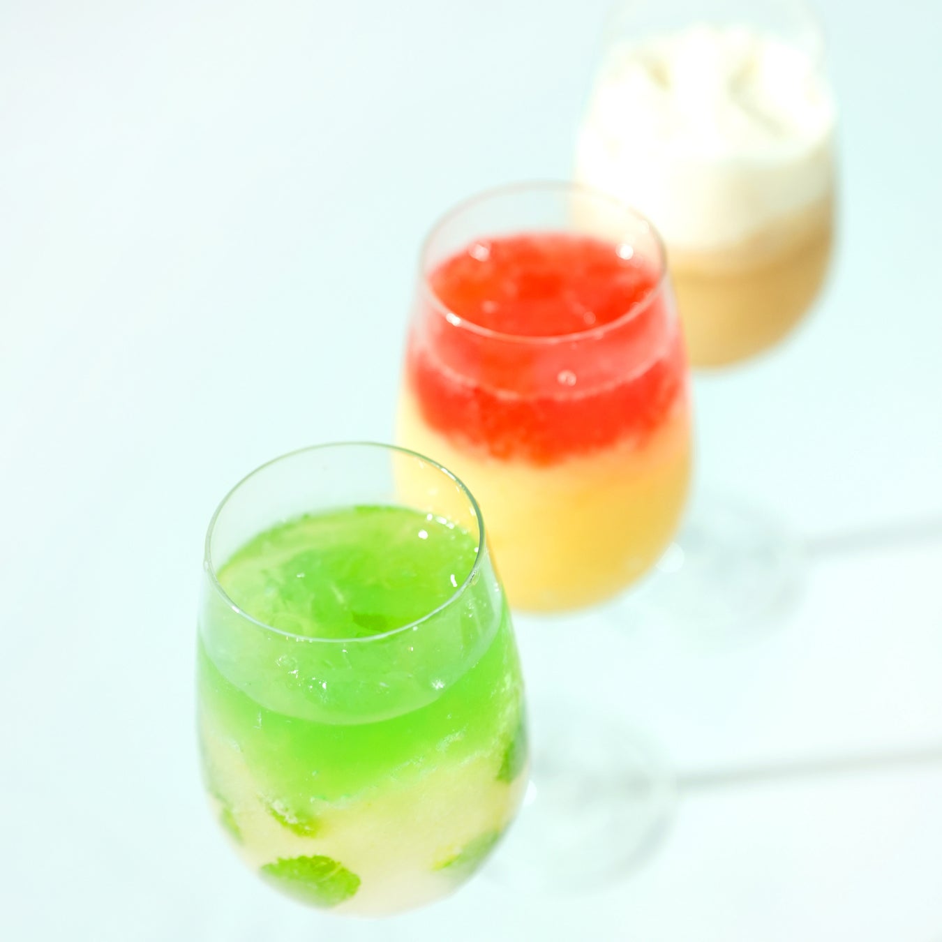 梅モヒートをフローズンに仕上げたフラッペ層、梅とハッカのジュレ層を重ねソーダを注ぎ、スライスしたパイナップルとアイスに梅最中とパラソルを添えました。スーッと刺激的で爽快な涼を楽しむ梅酒カクテルフラッペです。