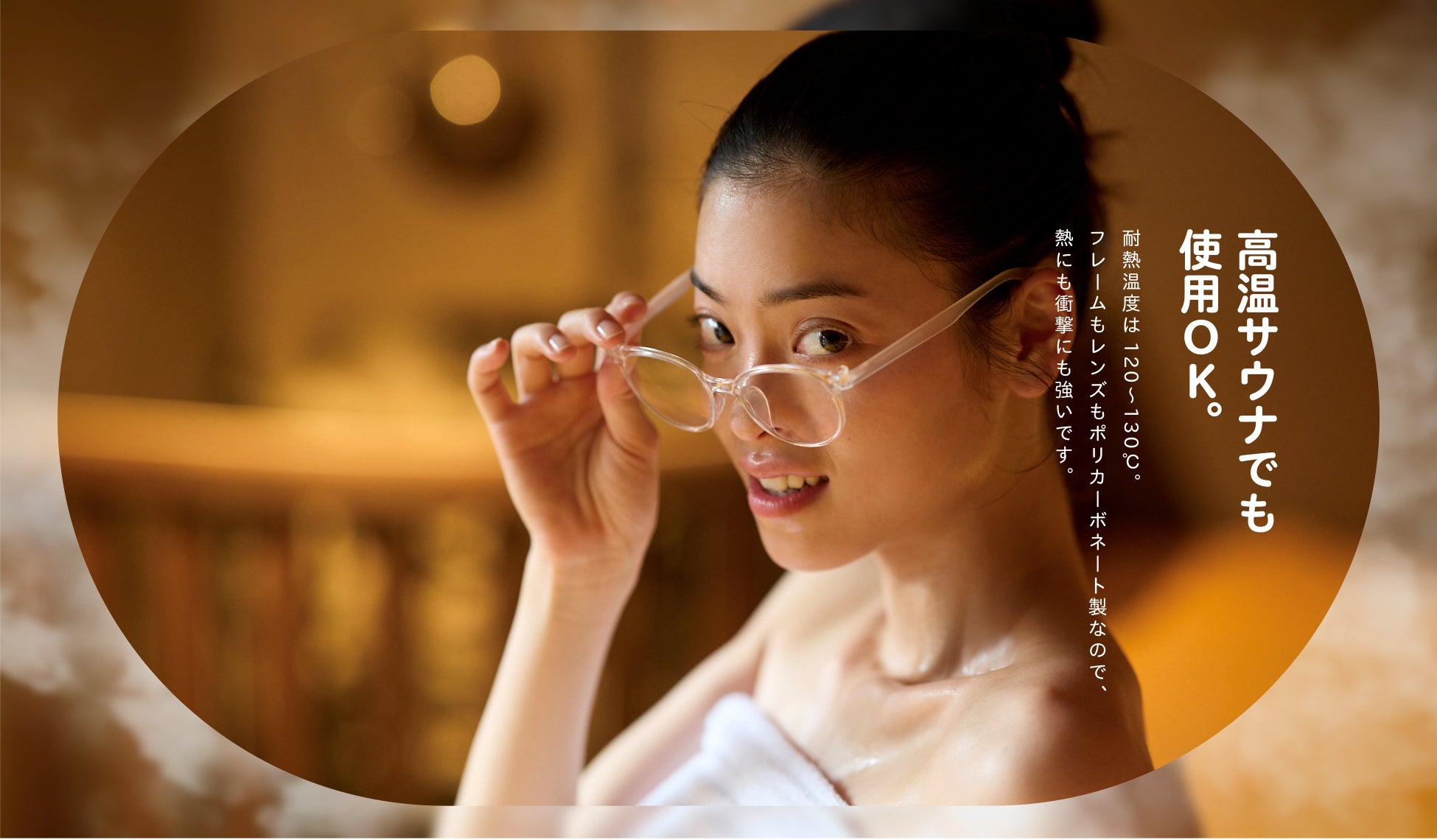 通常、メガネは熱に弱いため、お風呂やサウナでは使用できません。また、コンタクトレンズを装用して入浴すると、眼球に負担がかかり思わぬトラブルに見舞われる可能性もあり危険です。だからといって裸眼では見えにくいため入浴を楽しむことができません。熱に強く、錆びることがないよう、全ての素材をポリカーボネート素材に。くもりにくいレンズのFORゆはお風呂やサウナで快適に使用していただくことを前提とした機能的なメガネです。レンズのくもりにくさが何度も復活する”ととのえシ~ト”の付属など、ユーザーの声を反映してリニューアルした「AIGAN FORゆⅡ」は、昨今のサウナブームやSNSなどで話題となり、お客様からご好評をいただき愛眼を代表するメガネとなりました。