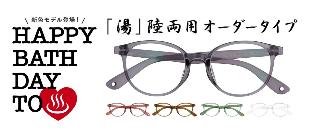 2013年の発売以来、多くの方にご愛用いただいているお風呂用メガネ「AIGAN FORゆ」は2021年、お風呂サウナ用メガネとしてデザインを一新し「AIGAN FORゆⅡ」として生まれ変わりました。快適な視界を提供することで、“お風呂とサウナを安心してさらに楽しんでもらいたい”そんな想いから生まれました。足元や銭湯の効能、サウナのテレビや砂時計が見やすいのもお風呂サウナ用メガネだからこそ。2022年11月26日には愛眼公式オンラインショップ限定で左右度数差・乱視に対応したオーダータイプ(クリアのみ)の販売を開始。そして10周年を迎えた「いい風呂の日」の2023年11月26日(日)よりお風呂やサウナの使用だけでなく、普段使いのファッションメガネにもできる“「湯」陸両用”のオーダータイプ限定で新色カラーモデルを展開致します。