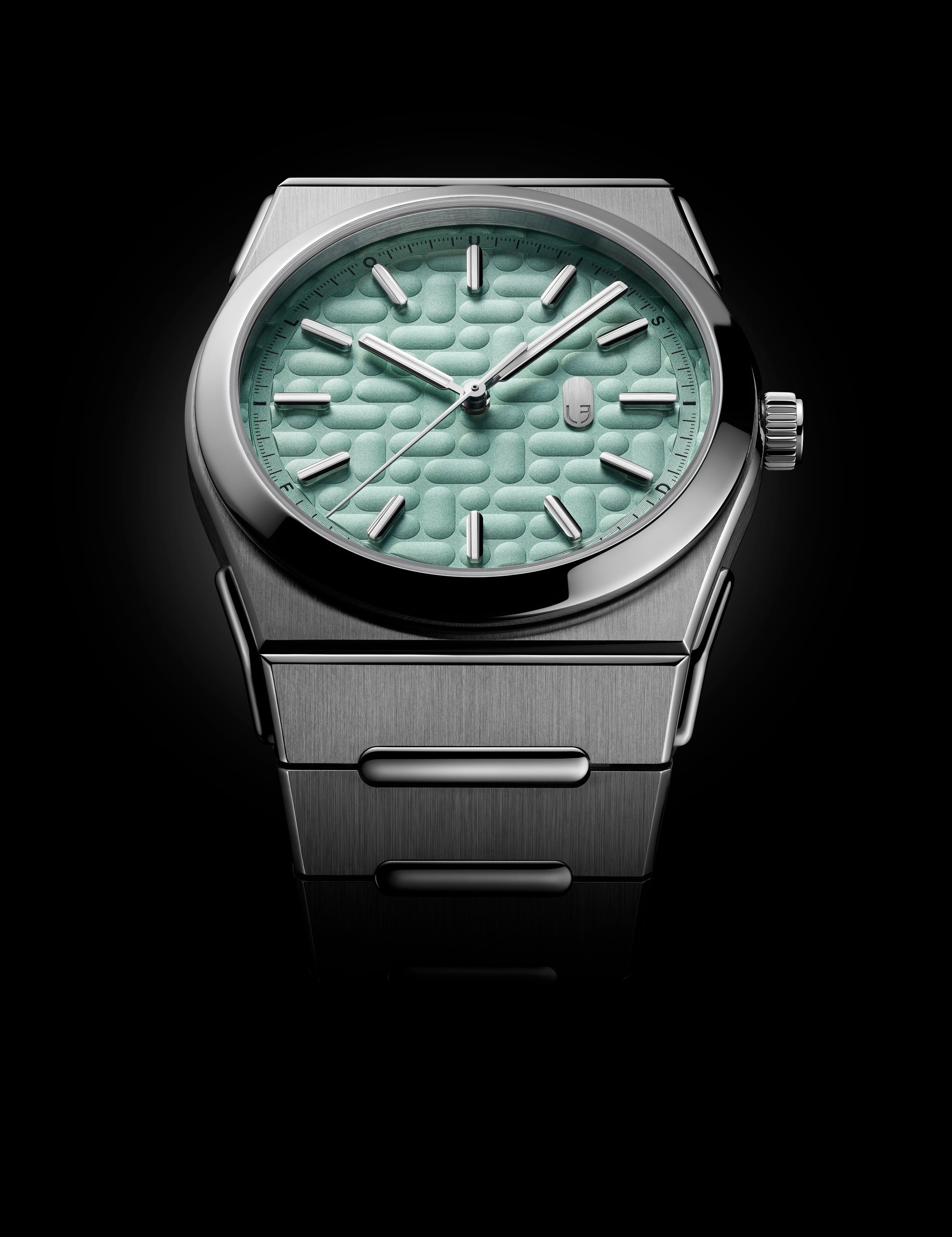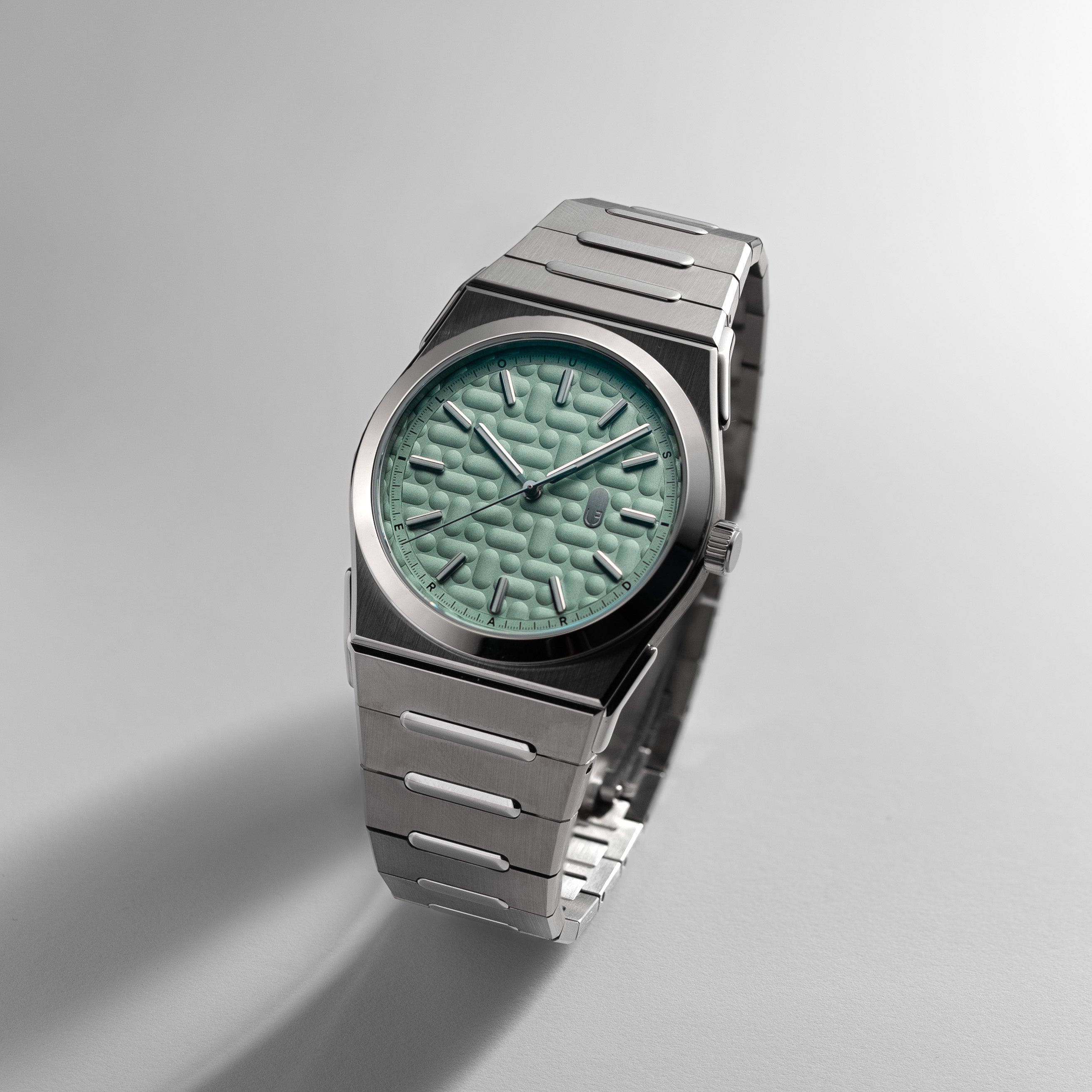 ミントの文字盤には遊び心のある長方形の「ピル」模様をあしらいました。3時位置に