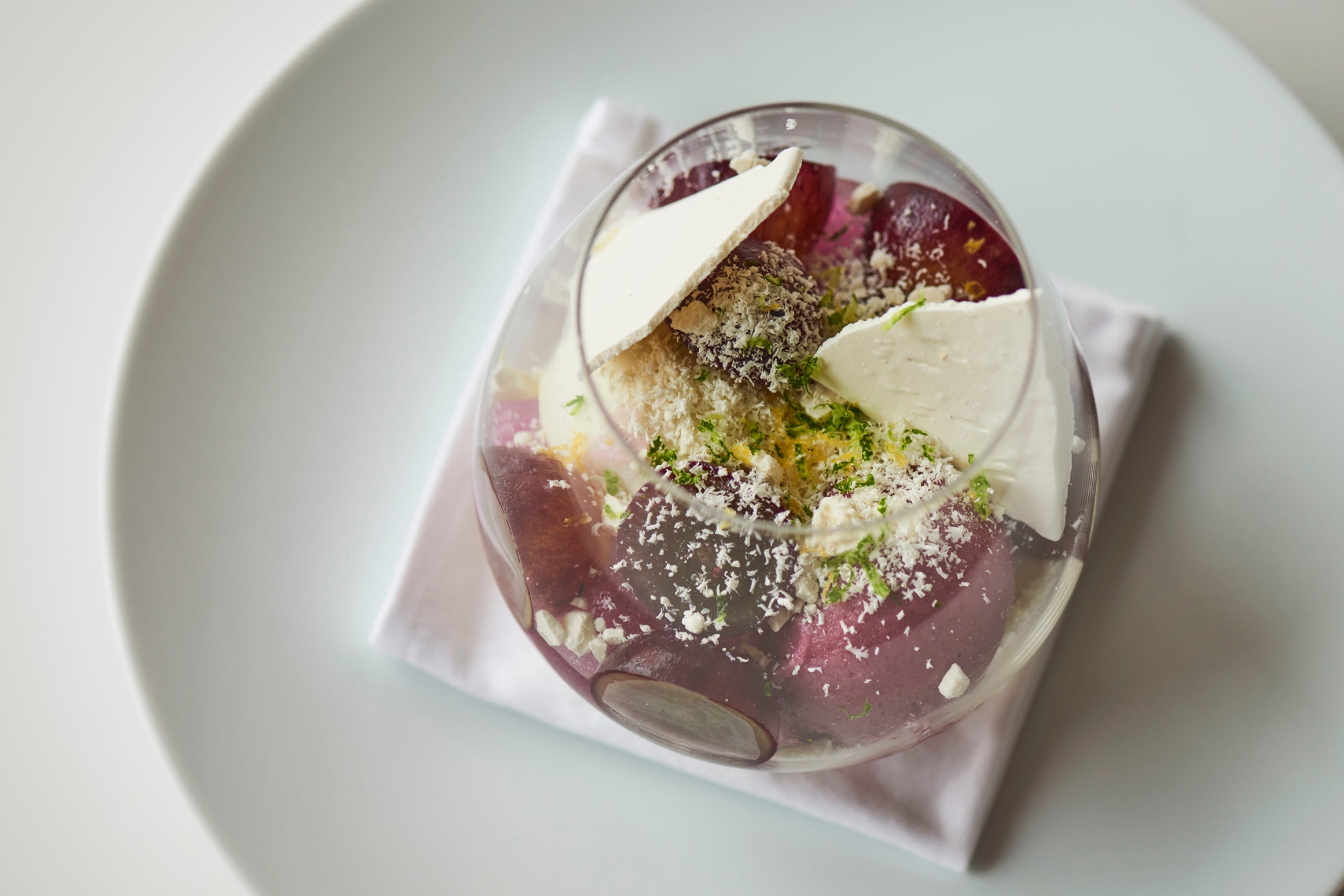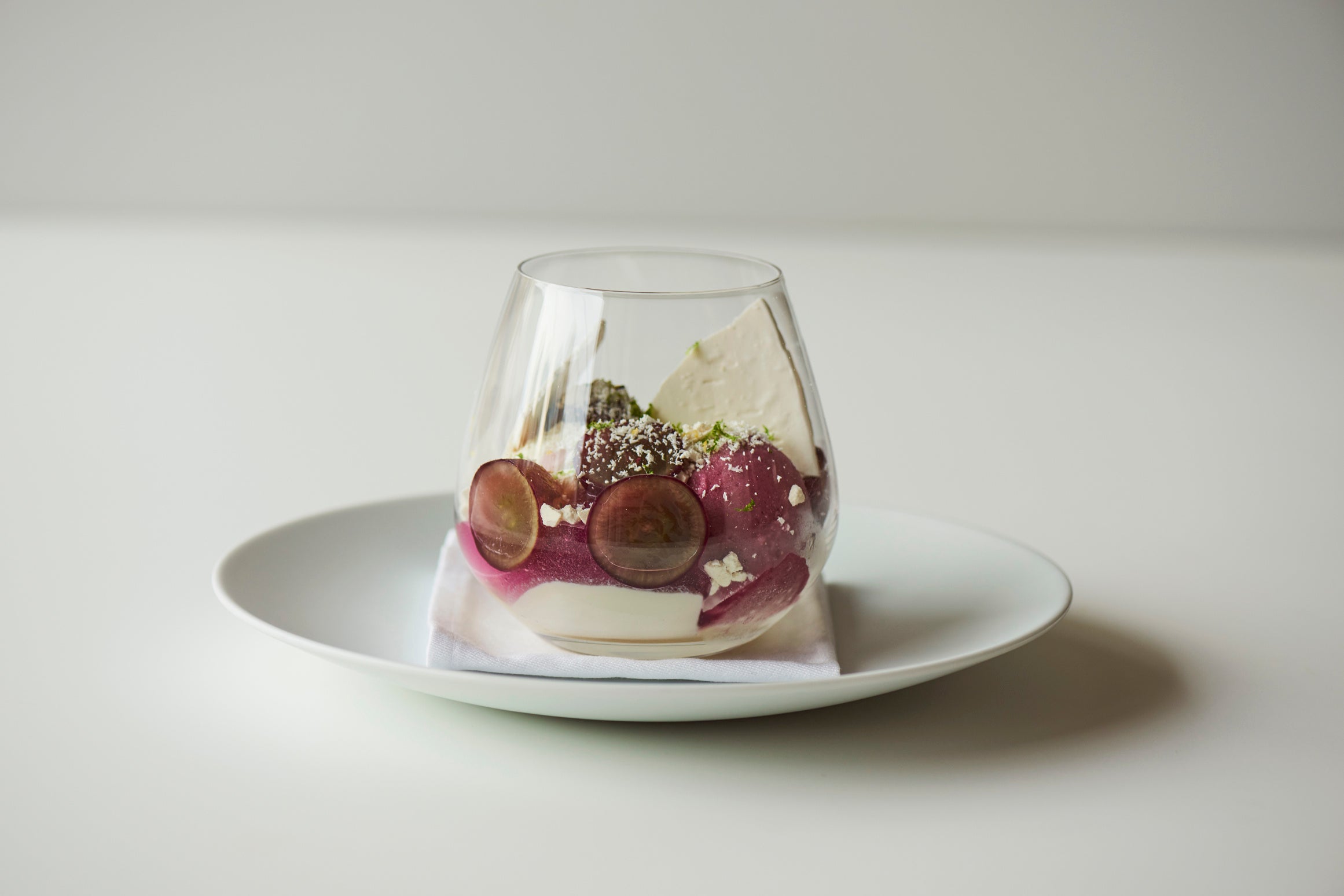ぶどうをできる限りシンプルに楽しんでいただけるように、相性の良いハーブや柑橘類をふんだんに使用したグラスデザート「Glass Dessert Classic」をベースに、ぶどうはそのまま輪切りにして使用するほか、ぶどうの皮のエキスをレモンとハーブと合わせた鮮やかな美しい紫色が特長のジュレに仕立てました。