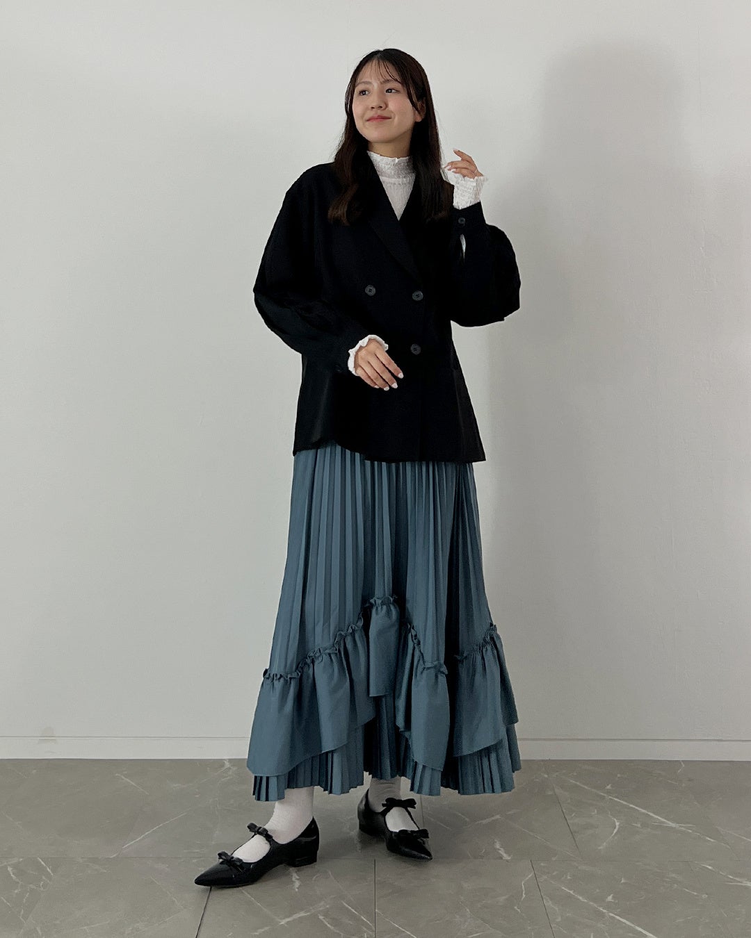 ゆるやかなシルエットのジャケットは、カッチリしすぎず「自分らしさ」を大切にしたい日にぴったりです。式典後はレースカットソーとニュアンスカラーのプリーツスカートを合わせれば、華やかさをほどよく添えつつ、ジャケットの堅さをほどよく崩し、着心地も叶えながら日常にも自然に馴染む着回しスタイルが完成します。