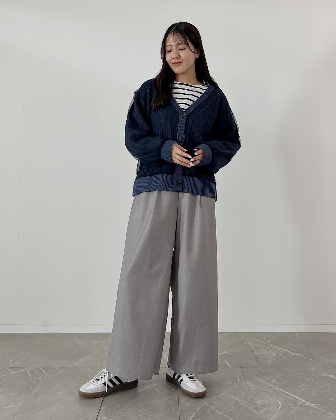 洗練されたセットアップは、上下を揃えれば式典でも凛としたハレの日スタイルに。日常では単品使いで着回せ、パンツにはボーダー柄カットソー、羽織りにはネイビーのチュールカーディガンを添えるだけで、さりげなくカジュアルダウン。手持ちの服にも自然に馴染み、式典後の毎日にもそっと寄り添う頼もしい一着です。