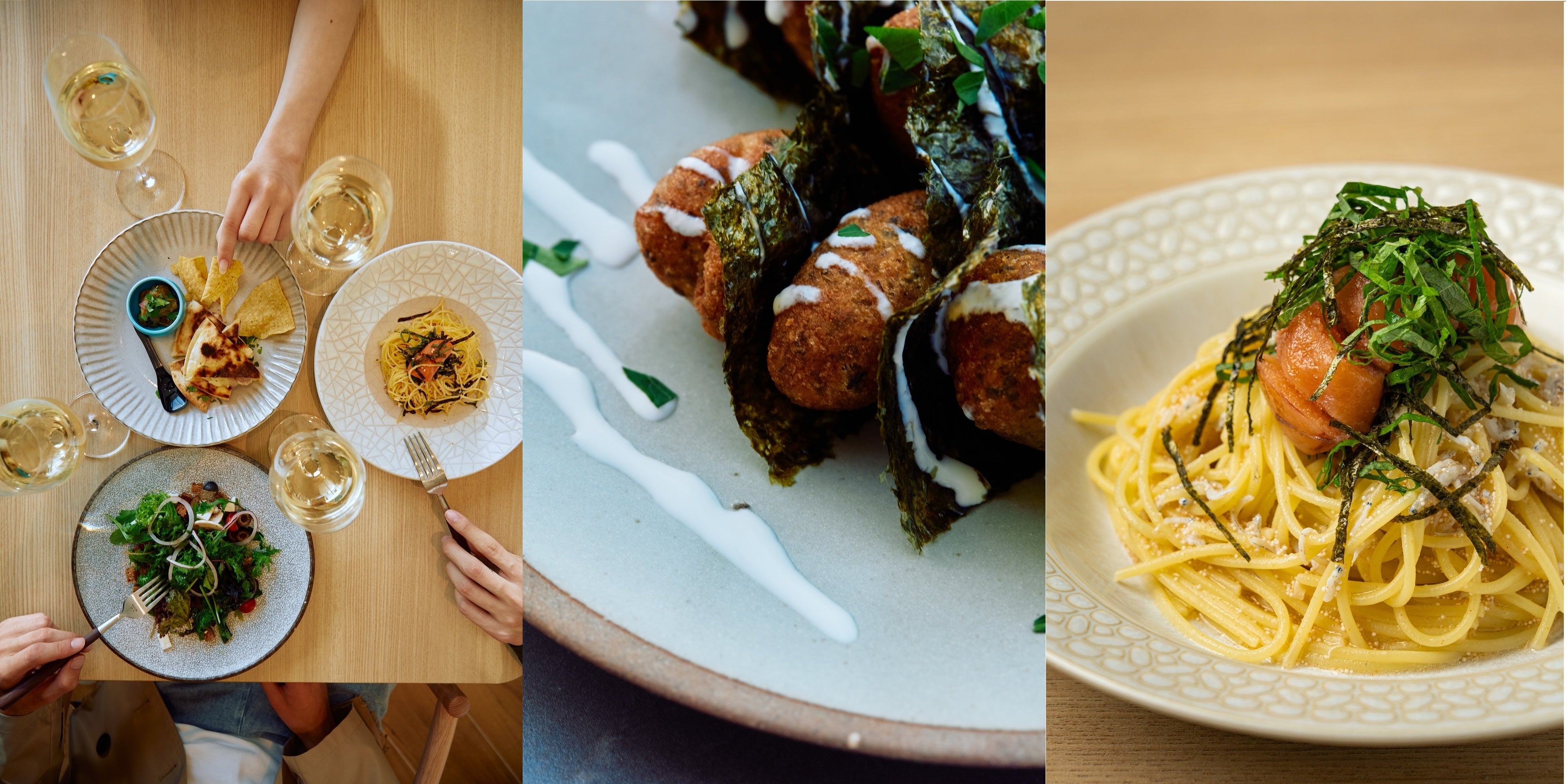 ホテル2Fの「Eatery」と「Cafē & Bar」では、地元福岡の海の幸や山の幸をふんだんに使った多種多様な創作メニューや、彩り鮮やかな朝食BOXをご用意しています。お食事は、同フロアのラウンジや屋外テラスでお楽しみいただけるほか、テイクアウトで客室でもお召し上がりいただけます。