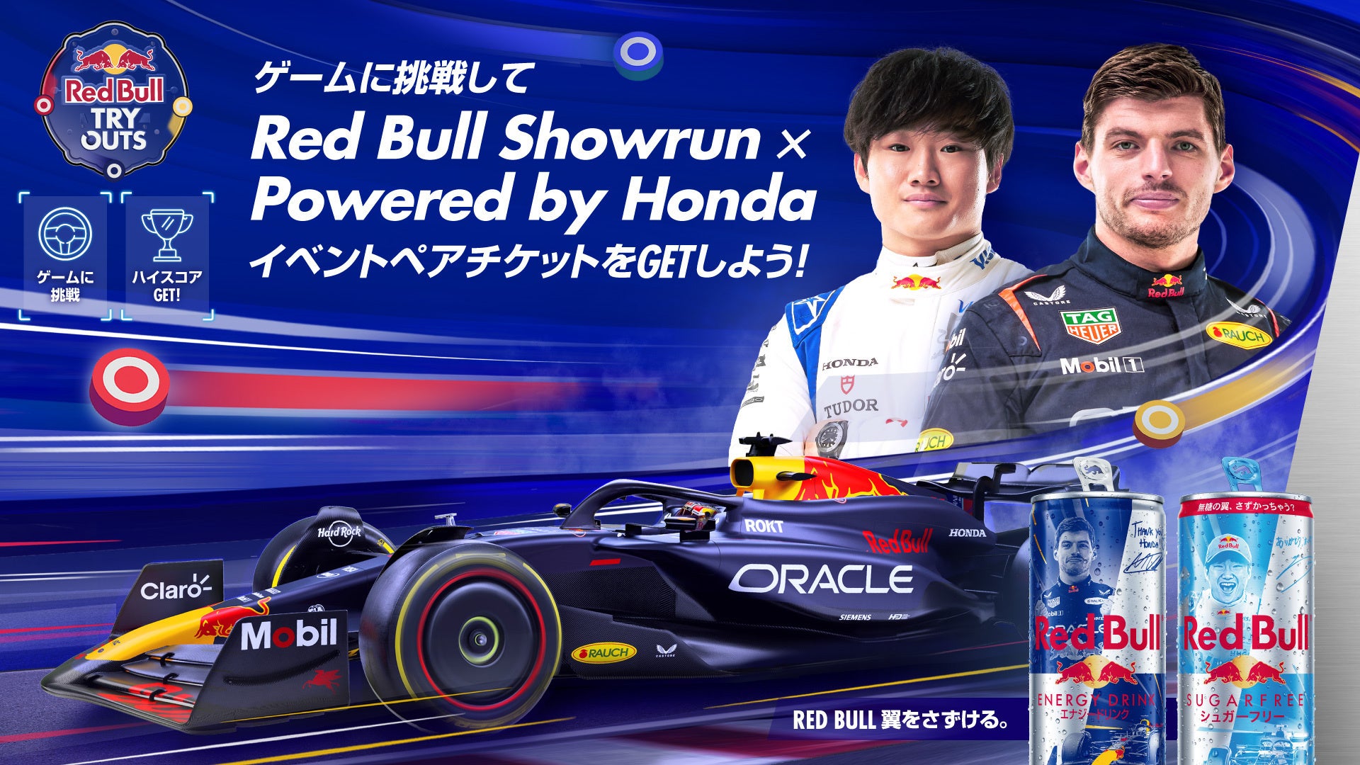 キャンペーン期間中、RedBull.com内のオンラインゲーム「Red Bull TRYOUTS」をプレイいただいた方の中から抽選で25名様にRed Bull Showrun x Powered by Hondaイベントペアチケット、レッドブル商品、イベントオリジナルTシャツのセットをプレゼントします。4月2日(水)にTOKYO BAY(お台場・青海)で開催されるF1デモランイベントを家族や友人と楽しめるチャンス!キャンペーン期間は3月7日(金)12:00 ~ 3月10日(月)23:59です。レッドブルを飲んでドライバーに必要なスキル「記憶力・反射神経・集中力」が問われるゲームにトライして一生に一度の特別体験を掴み取れ!