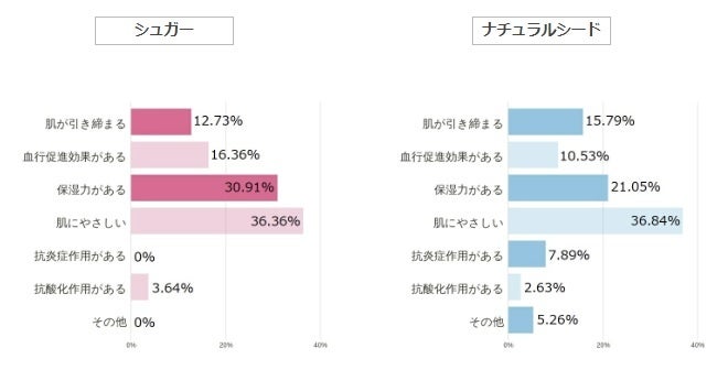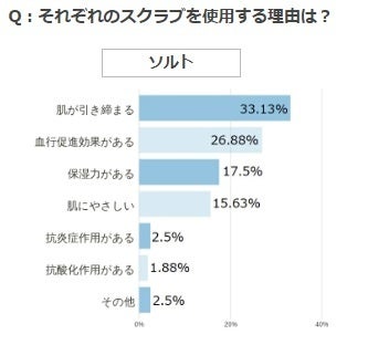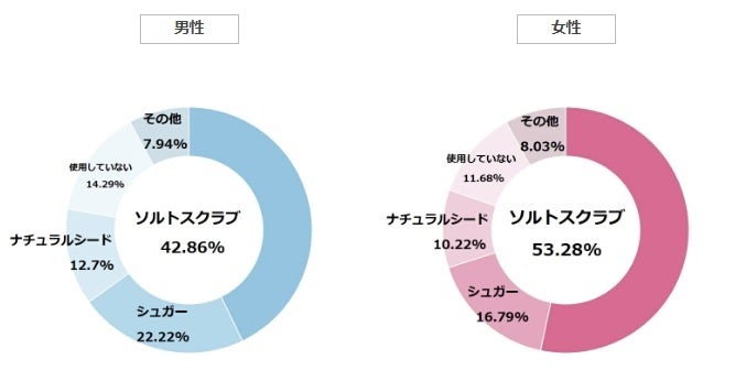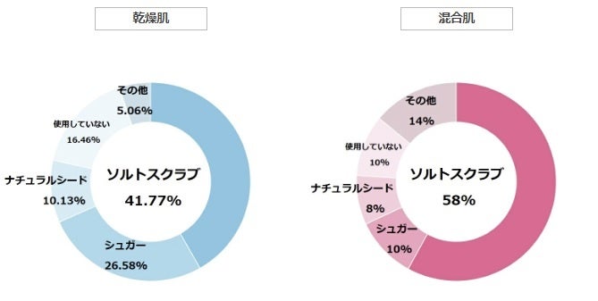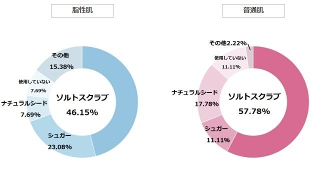 ただ、乾燥肌の人を見てみると、ソルト使用が1位であるものの、半数には満たず、シュガーの使用率が普通肌・混合肌の人よりも多い割合となりました。 シュガースクラブは保湿効果があるため、乾燥肌の人には向いていると言えそうです。
