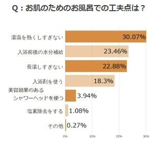 アンケート結果より多くの人が実践している“湯温を熱くしすぎない”という工夫。 熱すぎるお湯は必要以上に皮脂を落としてしまうため、皮膚バリアの機能を低下させてしまいます。また、かゆみの原因となる「ヒスタミン」の発生原因ともなりますので、お肌のためには42℃以上の熱いお風呂は避けるのがベストでしょう。