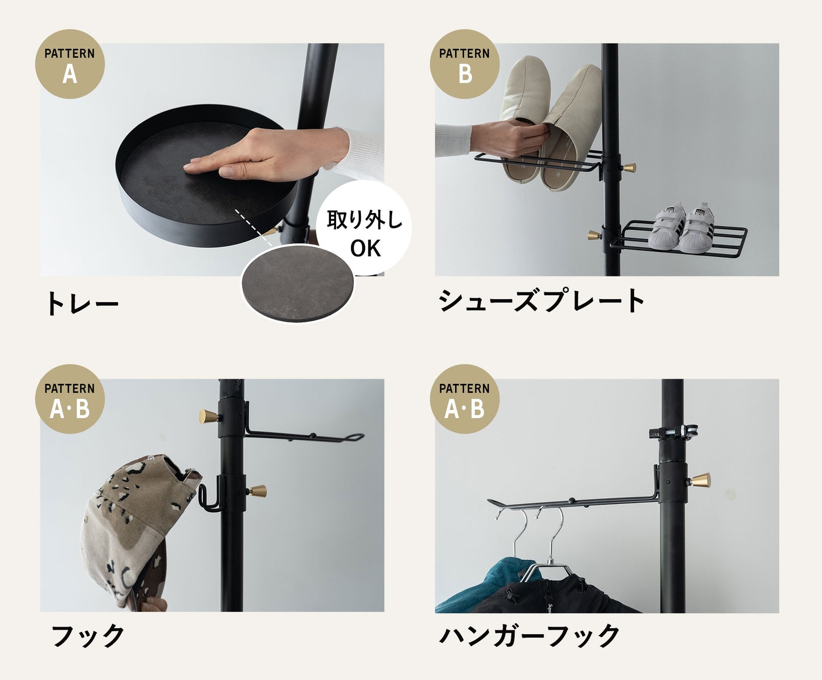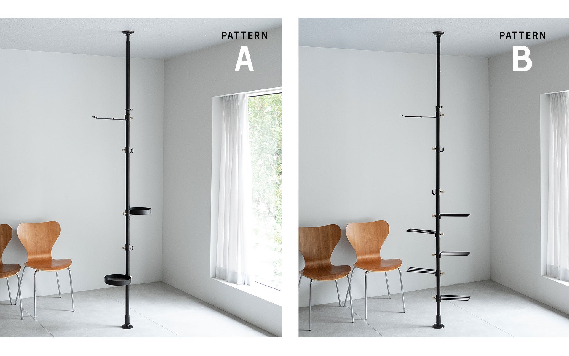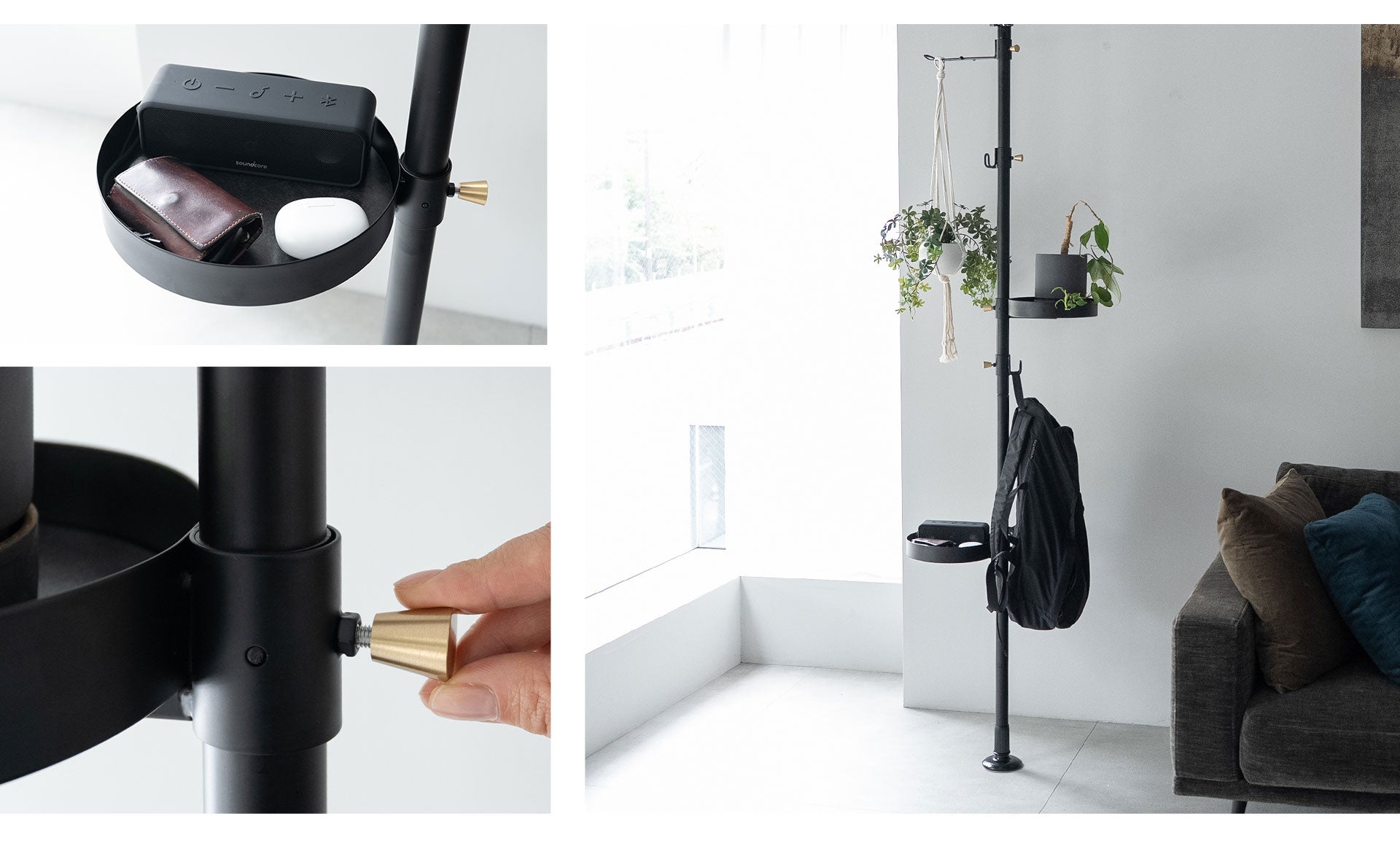 ノワールは、天井と床で突っ張る方式のポールハンガー兼収納ラックです。シックなマットブラックのスチールに、控えめに輝くゴールドの固定ネジがアクセント。