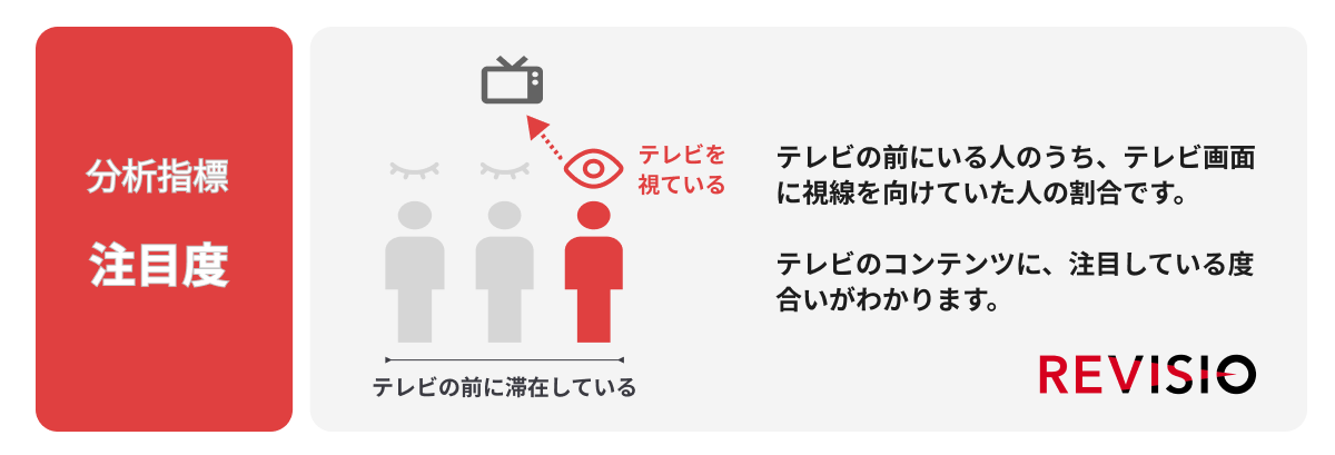 テレビの前にいる人(滞在者)のうち、テレビ画面に視線を向けていた人(注視者)の割合を表します。シーンに注目している度合いがわかります。