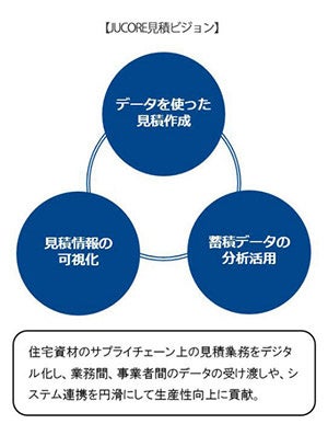 「JUCORE 見積」は物件情報、見積内容、受注見込、予算実績管理等のデータの一元管理といった見積業務の効率化を実現する業界特化型のクラウドサービスです。見積業務の省力化、脱属人化、データの可視化を実現。大手建材メーカー25社※1が既に導入している一般社団法人全国住宅産業地域活性化協議会※2の見積共通フォーマット※3に対応し、2023年9月にサービスを開始しました。建材流通事業者の見積書作成時の業務負荷軽減、生産性向上、合理化による経営効率向上を支援します。