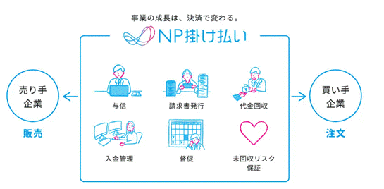 「NP掛け払い」は、企業間取引(BtoB)向けの後払い決済サービスです。当社が売り手企業と買い手企業の間に入り、買い手企業への与信から請求書発行、代金回収までの決済・請求業務全てを請け負います。NP掛け払いの導入により、売り手は決済・請求業務をまるごとDX化し、本来業務により集中できます。また未回収リスクの保証もするため、経営基盤の安定化を図れます。さらには、従来の信用機関に依存しない独自の与信審査によって、個人事業主を含む事業者に対して与信通過率99%(※1)と柔軟に掛け売りを提供することができ、販路拡大・売上向上が見込めます。買い手は掛け払いを利用することで、キャッシュフローの改善を期待できます。