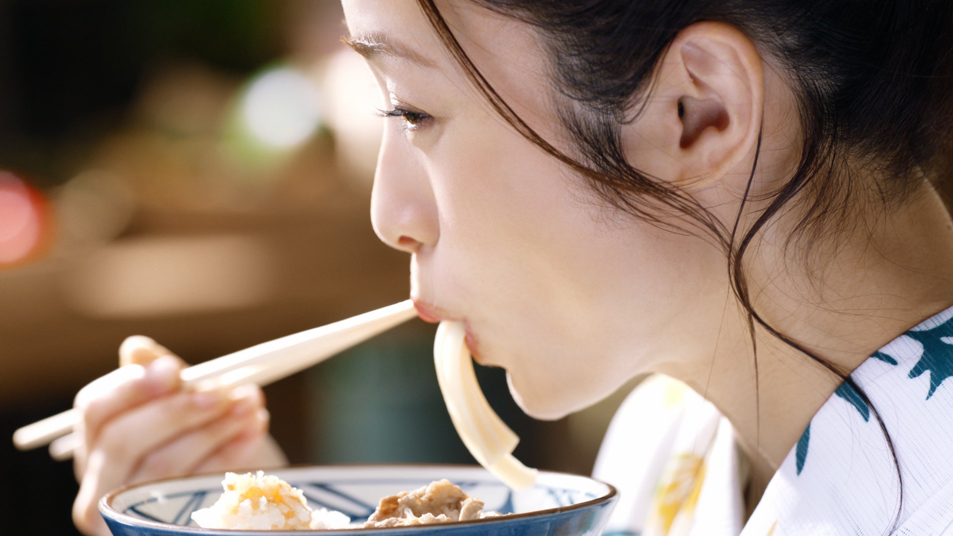 <浴衣姿の上戸さんが『鬼おろし肉ぶっかけうどん』をすすり、夏の到来を感じる爽やかなおいしさを堪能>