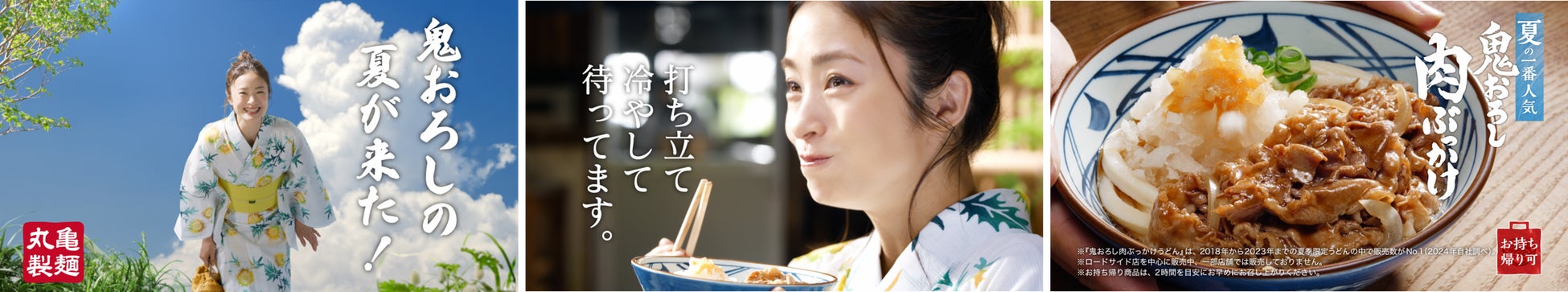 今回のTVCMに登場する夏季限定商品『鬼おろし肉ぶっかけうどん』は、麺職人が全店に誕生※2し、さらにおしさに磨きをかけた丸亀製麺のうどんを、コシのある“冷”で楽しめる商品です。暑い夏こそ、丸亀製麺でしか味わえない涼やかなおいしさをご堪能ください。