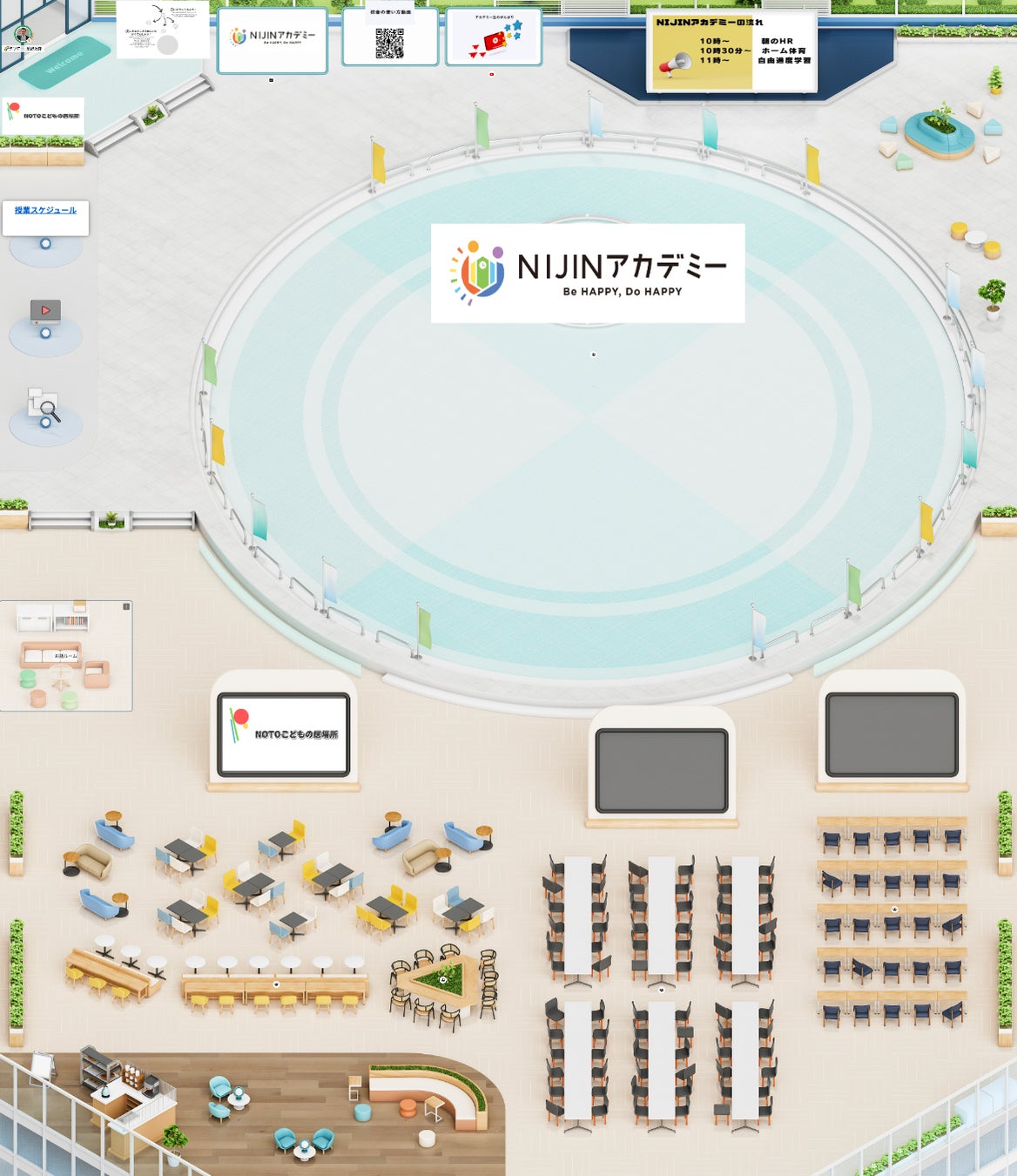 「NOTOこどもの居場所」は、oVice社が展開するバーチャルオフィス「ovice(オヴィス)」を活用し、NIJIN社が運営している小中学生向けオンラインスクール「NIJINアカデミー」内に新規スペースとして開設されるオンラインの空間です。