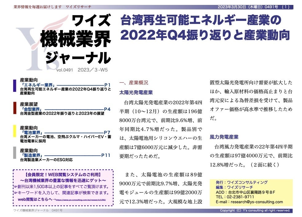ワイズコンサルティング グループ(本社:中華民国台北市、代表取締役:吉本康志)は台湾機械業界専門誌「ワイズ機械業界ジャーナル」の2023年3月第5週号を発行しました。今週号ではエネルギー業界、金型業界、電池業界と台湾製造業のESG対応の動向を紹介します。