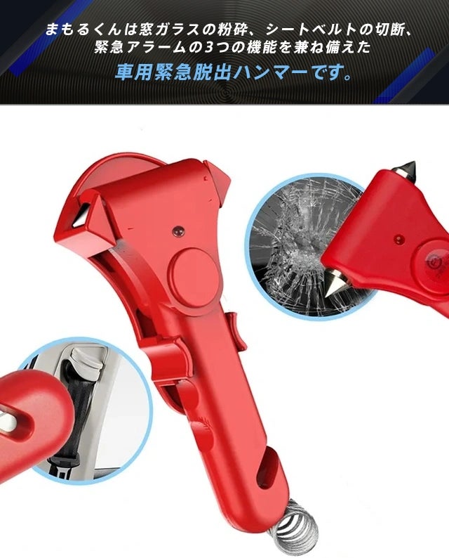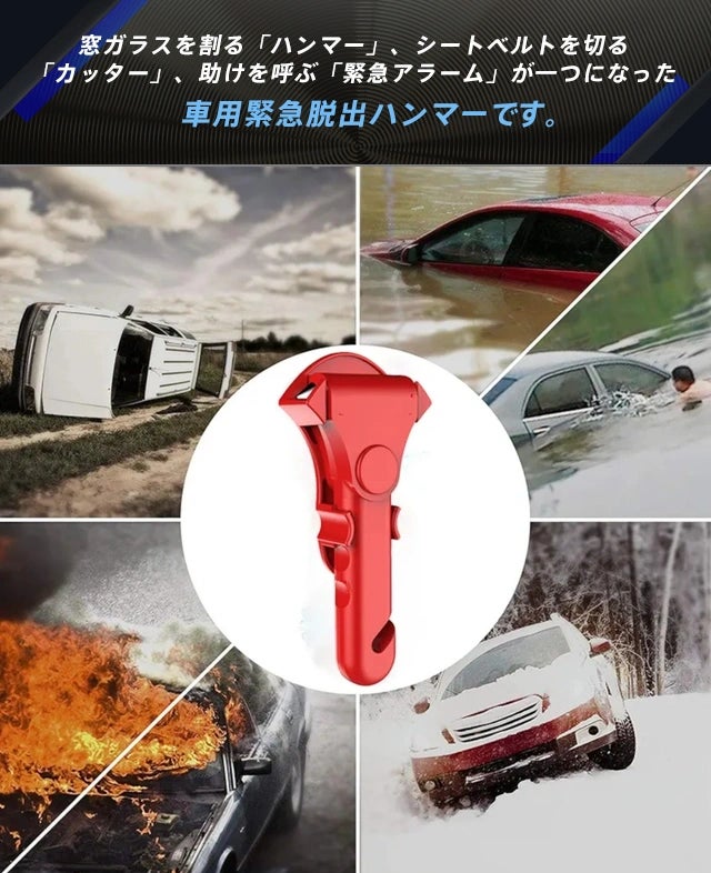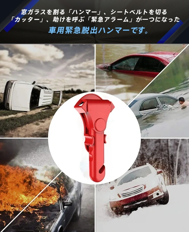 窓ガラスの粉砕、シートベルトの切断、緊急アラームの3つの機能を兼ね備えた車用緊急脱出ハンマー。