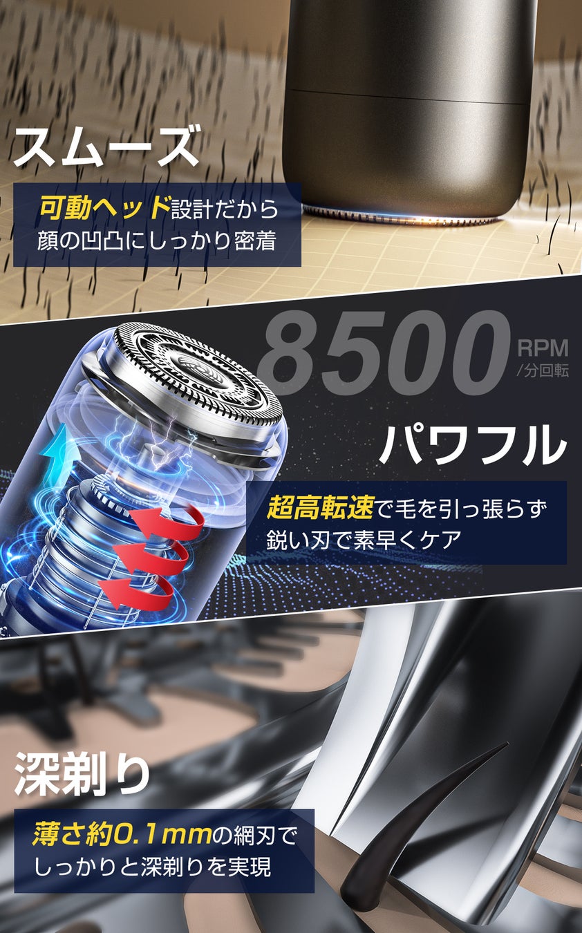 約8500RPMの超強力モーター搭載、切れ味が抜群で毛を引っ張らず鋭い刃で一気に素早くケアできます。