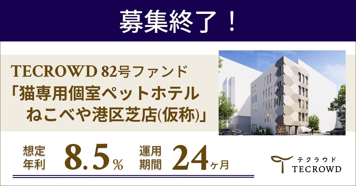 【想定年利8.5%】国内インカムゲイン+キャピタルゲイン型ファンド「猫専用個室ペットホテル ねこべや港区芝店(仮称)」に投資するTECROWD82号ファンドの募集終了