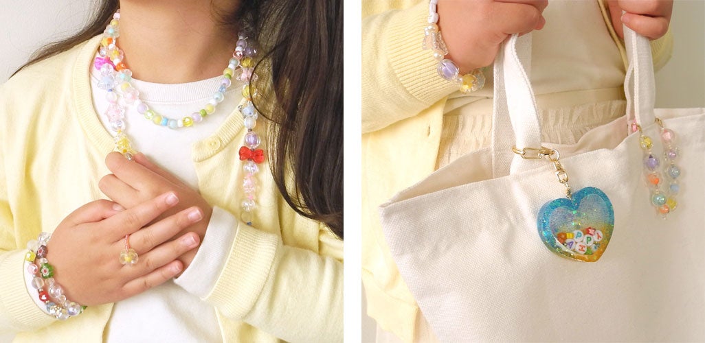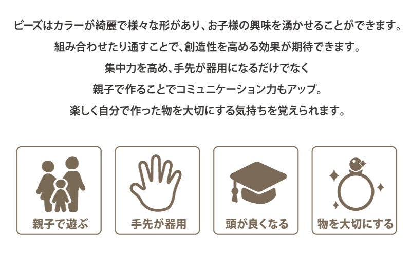 お子様だけでなく、大人もついつい手にとりたくなるような色鮮やかなビーズを使って、リングやネックレスなど、世界に一つだけのアクセサリーを親子一緒に作ってみてはいかかでしょうか♪