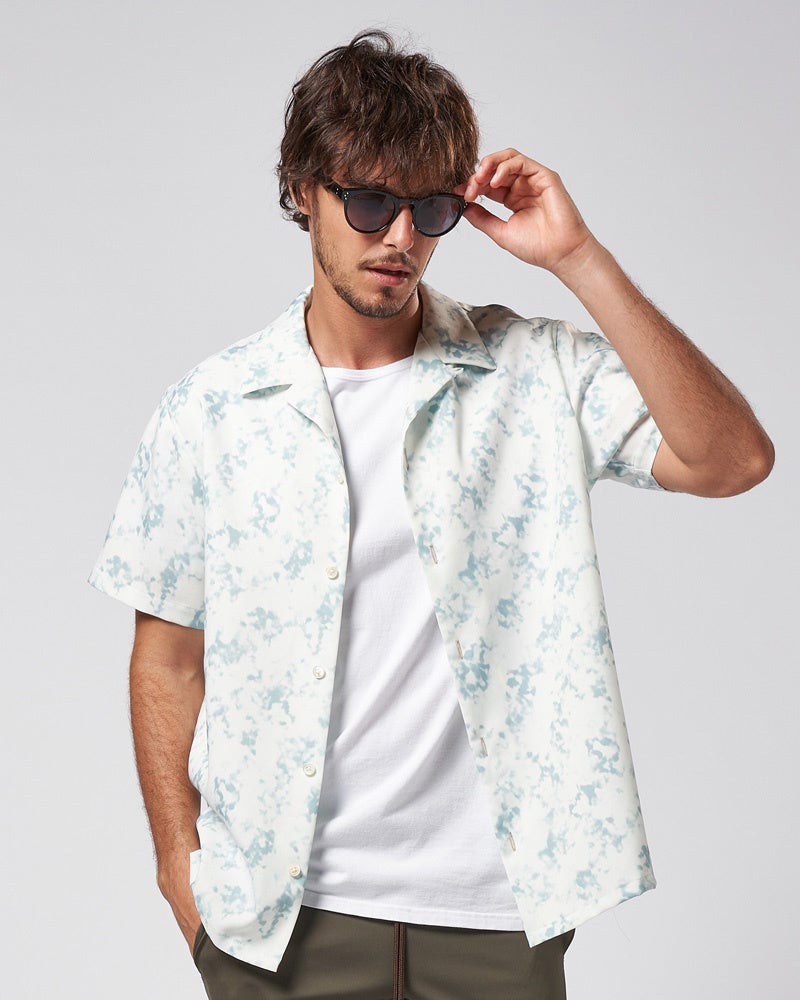 夏のアメカジ、ヴィンテージアイテムの代表であるハワイアンシャツをwjkの解釈でアレンジ。オリジナルで作成したムラ染めのようなマーブル柄プリントでリゾート感を演出したアイテム。