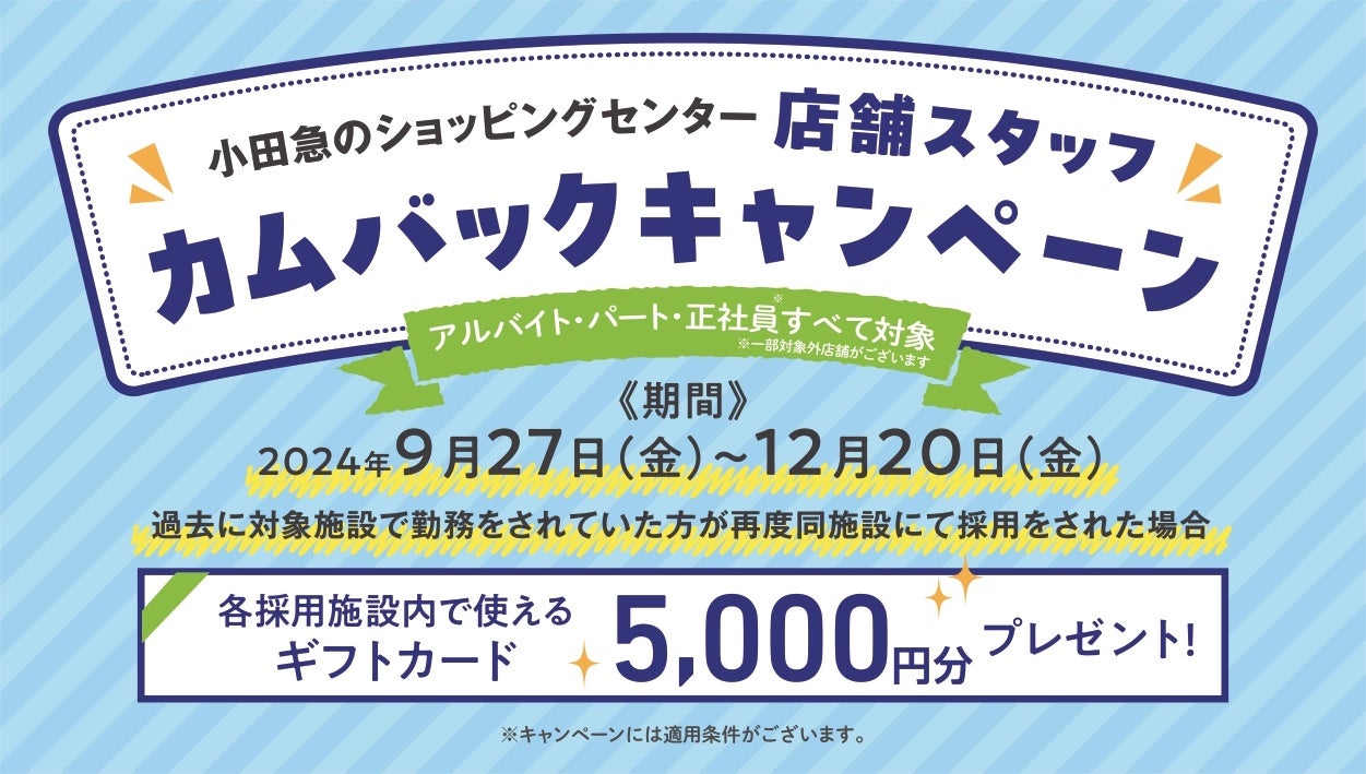 株式会社小田急SCディベロップメント(本社:東京都新宿区 取締役社長:細谷 和一郎)は、当社のショッピングセンターに出店する店舗スタッフの確保を目的に、「お友達紹介キャンペーン」と「店舗スタッフカムバックキャンペーン」を、2024年9月27日(金)~12月20日(金)の期間、実施します。