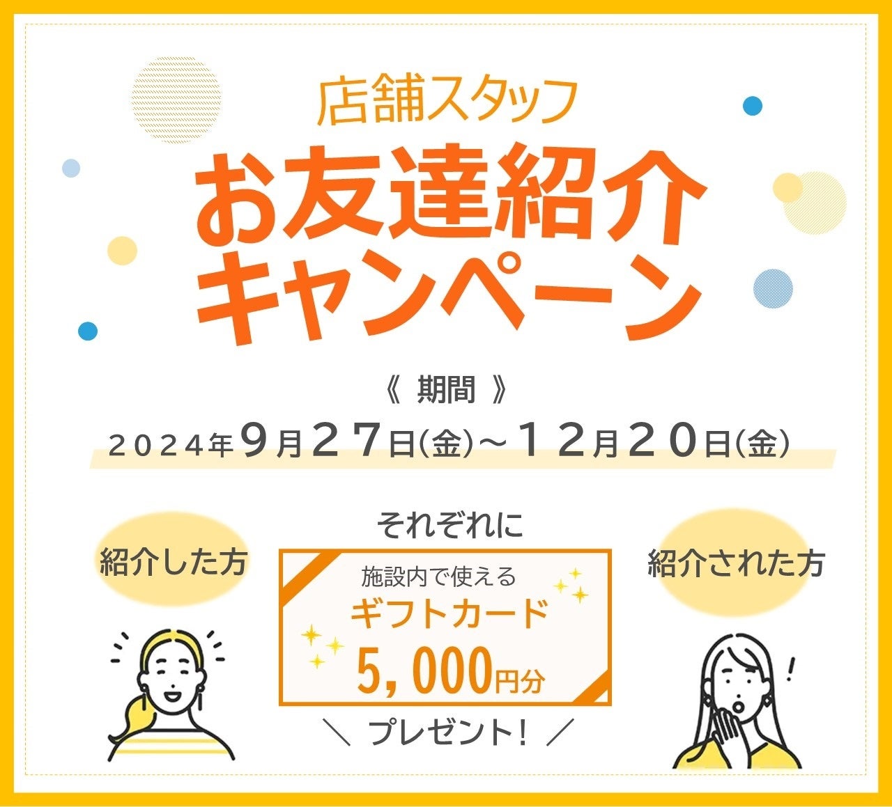 内容:対象施設の店舗スタッフの紹介を受けた方が、受付期間内に同一施設内の店舗で採用された場合、紹介した方・紹介を受けた方双方に、採用施設でご利用いただける5,000円分のギフトカードをプレゼントします。