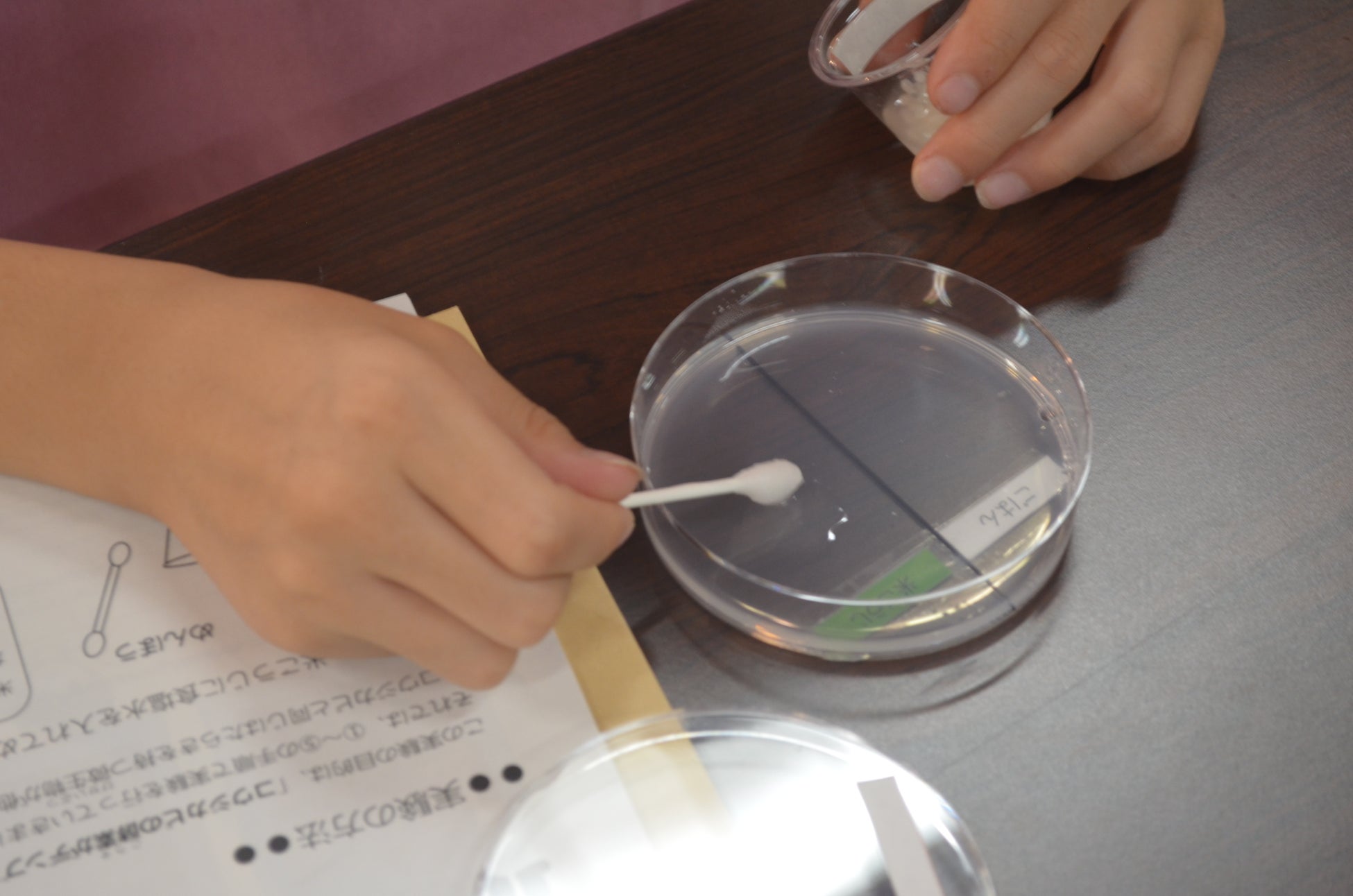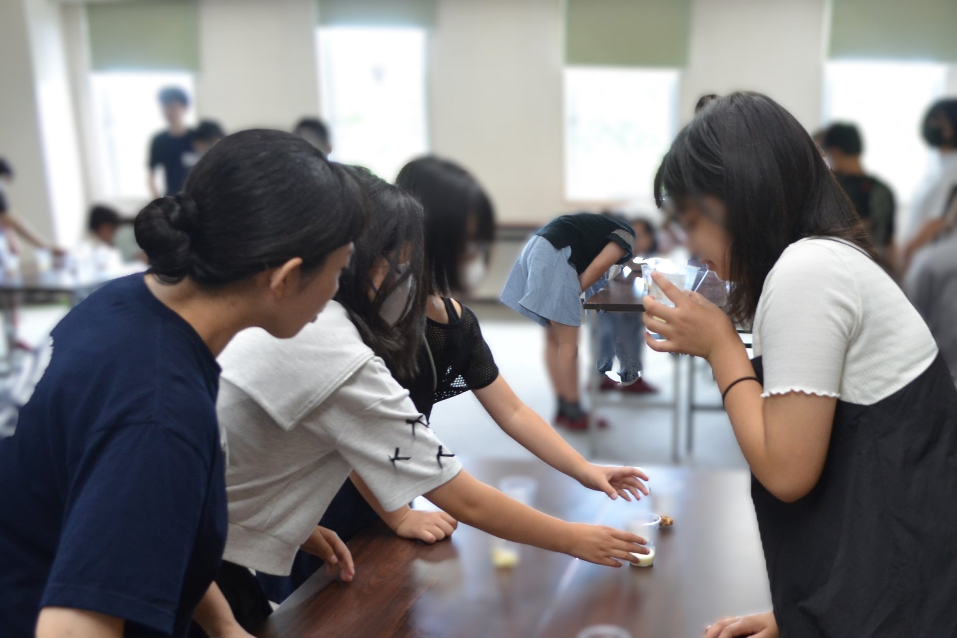 ○学習内容:微生物の基本的性質、微生物と発酵食品や生活・環境の関わりについての授業。実験を通して微生物の働きの体験やあま酒づくりの実演。休み時間には射的とスライム作りを行う。