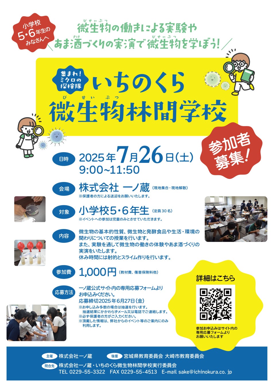 株式会社一ノ蔵(宮城県大崎市松山 代表取締役社長 鈴木 整)は、2025年7月26日(土)に小学校5~6年生を対象にしたサイエンスイベント「~集まれ!ミクロの探検隊~いちのくら微生物林間学校 」を開催する。