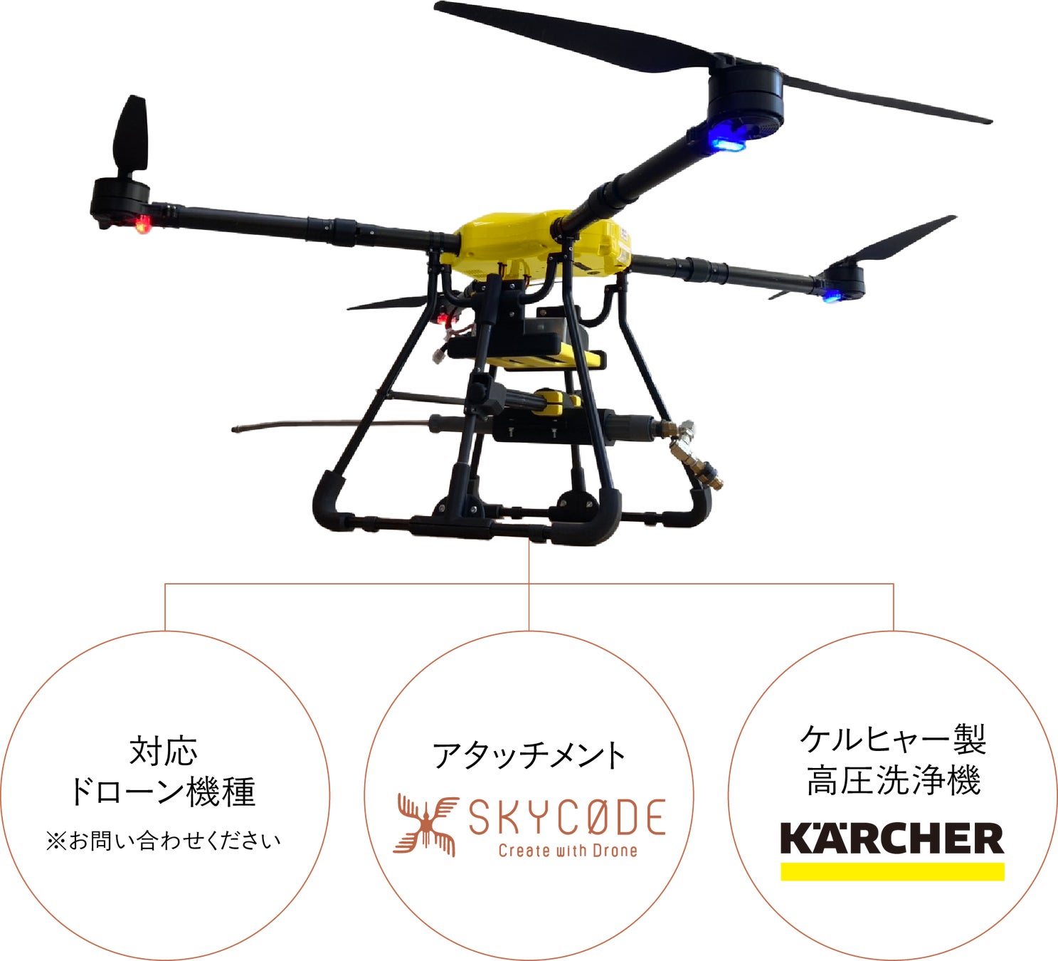 あらゆる主力ドローンに、ケルヒャー高圧洗浄機の噴射ノズルを搭載することを実現しました。これにより自由自在に空での高圧洗浄が可能になり、無限の可能性が広がります。