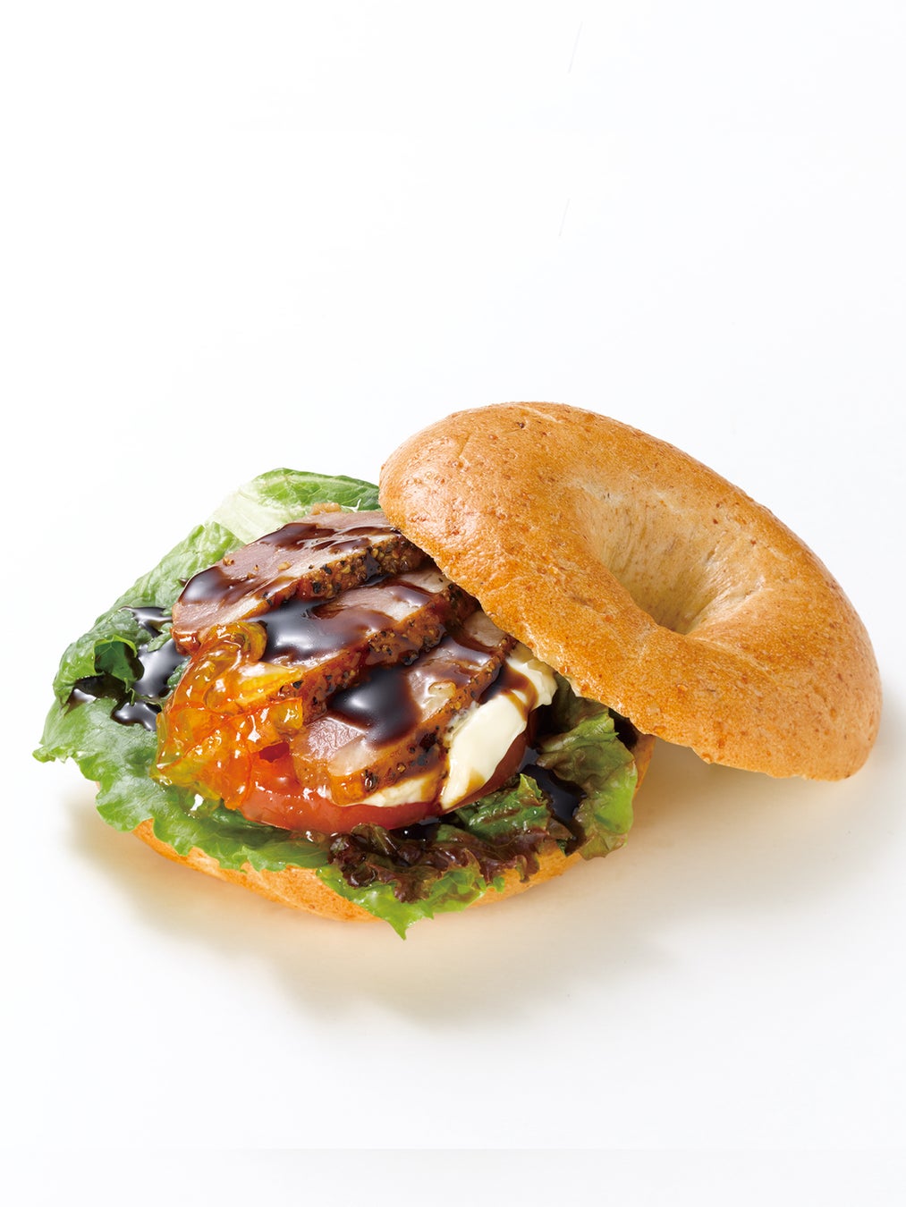 グラハムベーグルにジューシーな鴨パストラミを挟み鴨と相性の良いオレンジマーマレードの爽やかな甘みと苦み、バルサミコの酸味でアクセントをつけたベーグルサンドです。ボリューム感もあり夏の食事にぴったり。