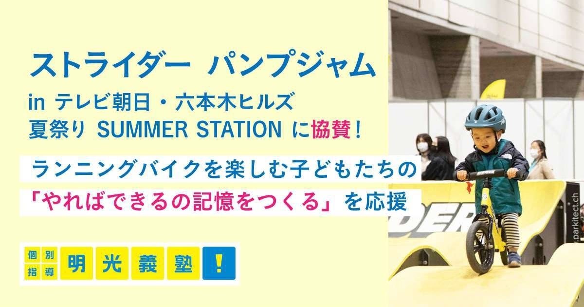 個別指導の「明光義塾」を全国展開する株式会社明光ネットワークジャパン(本社:東京都新宿区、代表取締役社長:山下 一仁)は、8月4日(日)に六本木ヒルズで開催される「ストライダー パンプジャム in テレビ朝日・六本木ヒルズ 夏祭り SUMMER STATION」に協賛いたします。明光義塾は本イベントの協賛を通じて、この夏ランニングバイクを楽しむ子どもたちの「やればできるの記憶をつくる」を応援します。