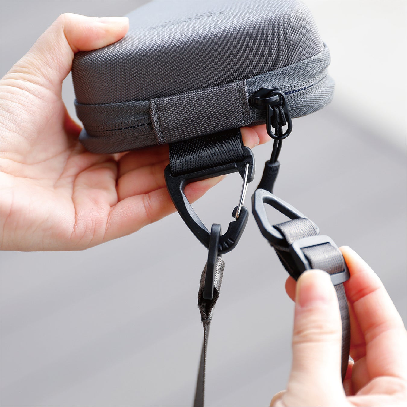 肩から掛けられるベルトは、カラビナで取り付けてあるので取り外し可能。