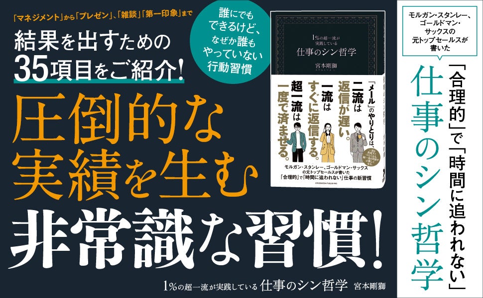 株式会社クロスメディア・パブリッシング(東京・渋谷区、代表取締役・小早川幸一郎)は、2022年10月3日に書籍『1%の超一流が実践している仕事のシン哲学』を刊行します。本書は外資系金融の世界でトップセールスをとり続けた宮本剛獅氏が、残業が多く、仕事の生産性が上がらないことで悩む読者に対して、「ほんのちょっとの工夫」で大幅な仕事の効率化や成果の向上を実現する方法を教える一冊です。