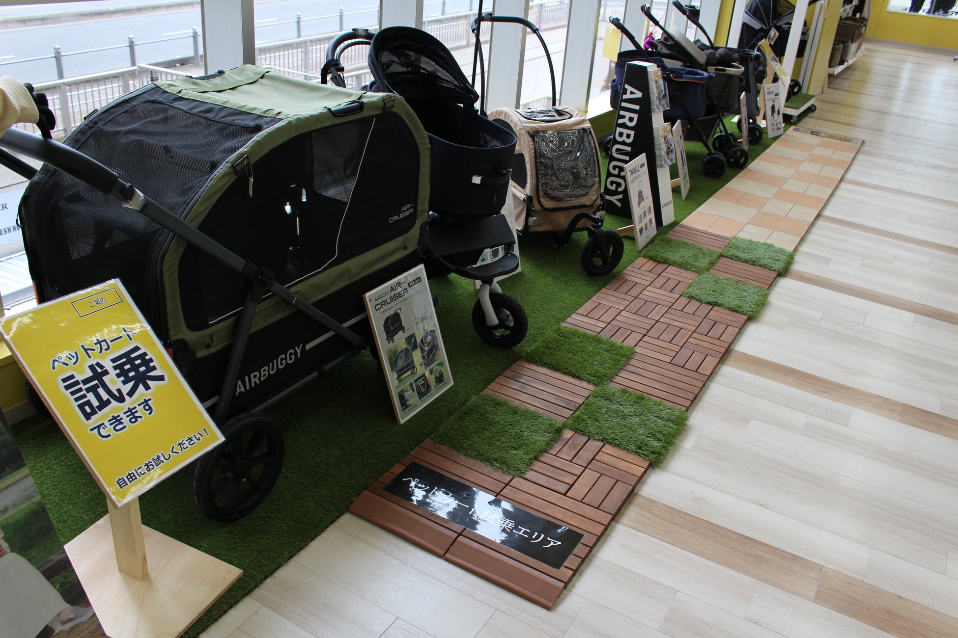 大切なペットと快適に暮らすためのペット用品を幅広く取り揃えます。デザイン・サイズともに充実したペットウェアは、地域最大級となる300種類以上を展開し、用途や好みに合わせてお選びいただけます。また、ペットカートは全台試乗が可能で、売場にはでこぼこ道や段差を再現した体験スペースを設け、押しやすさや操作のしやすさの違いをその場で比較・体感いただけます。