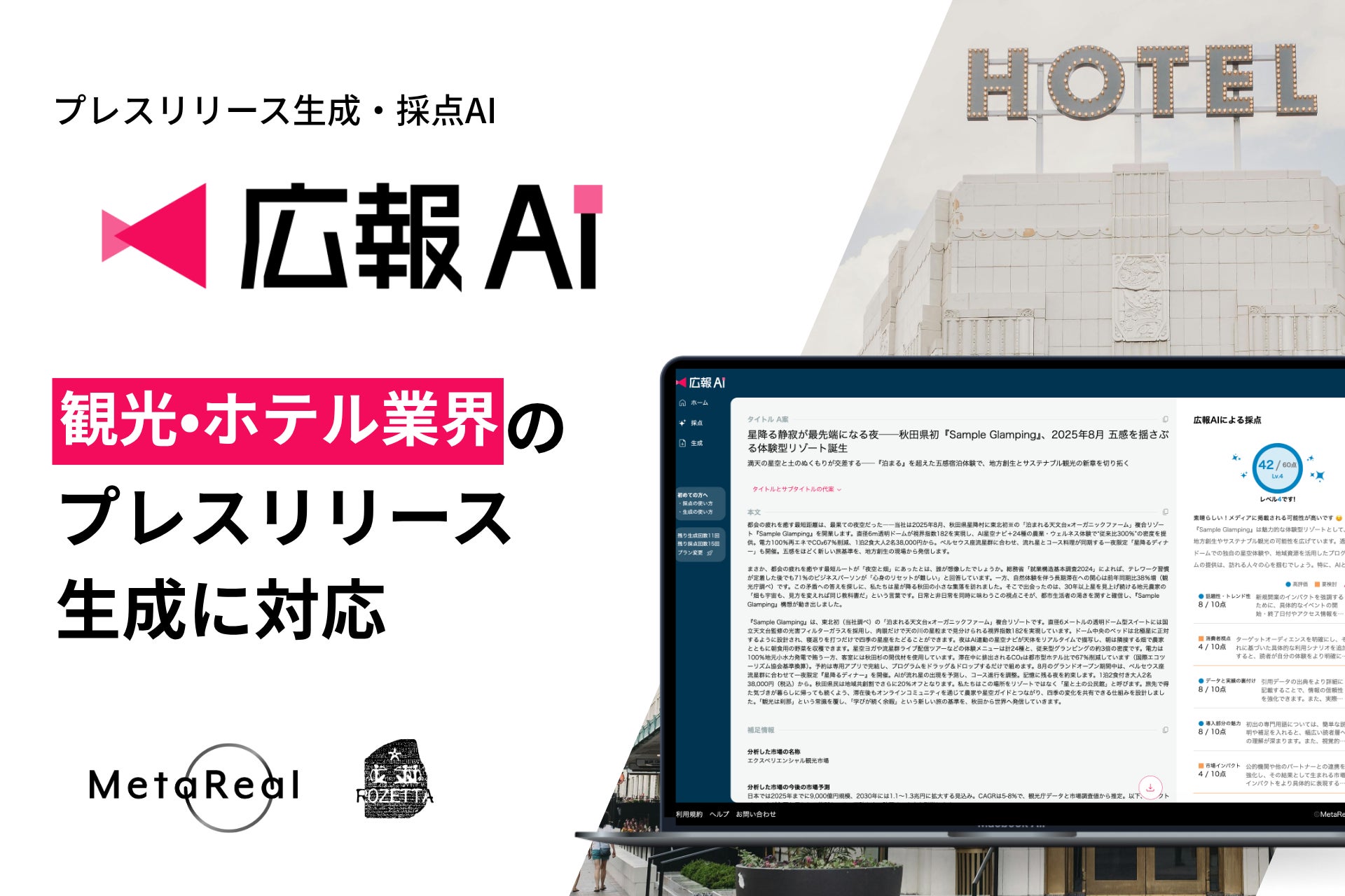 メタリアル・グループの株式会社ロゼッタ(本社:東京都千代田区、代表取締役:五石 順一)が提供する、メディアに掲載されやすいプレスリリースを生成・採点可能な『広報AI』が、観光・ホテル業界のプレスリリース作成に対応しました。宿泊施設や観光イベントの告知、季節キャンペーンなど、地域の魅力や体験価値を読者に伝えるリリースを迅速かつ効果的に生成します。